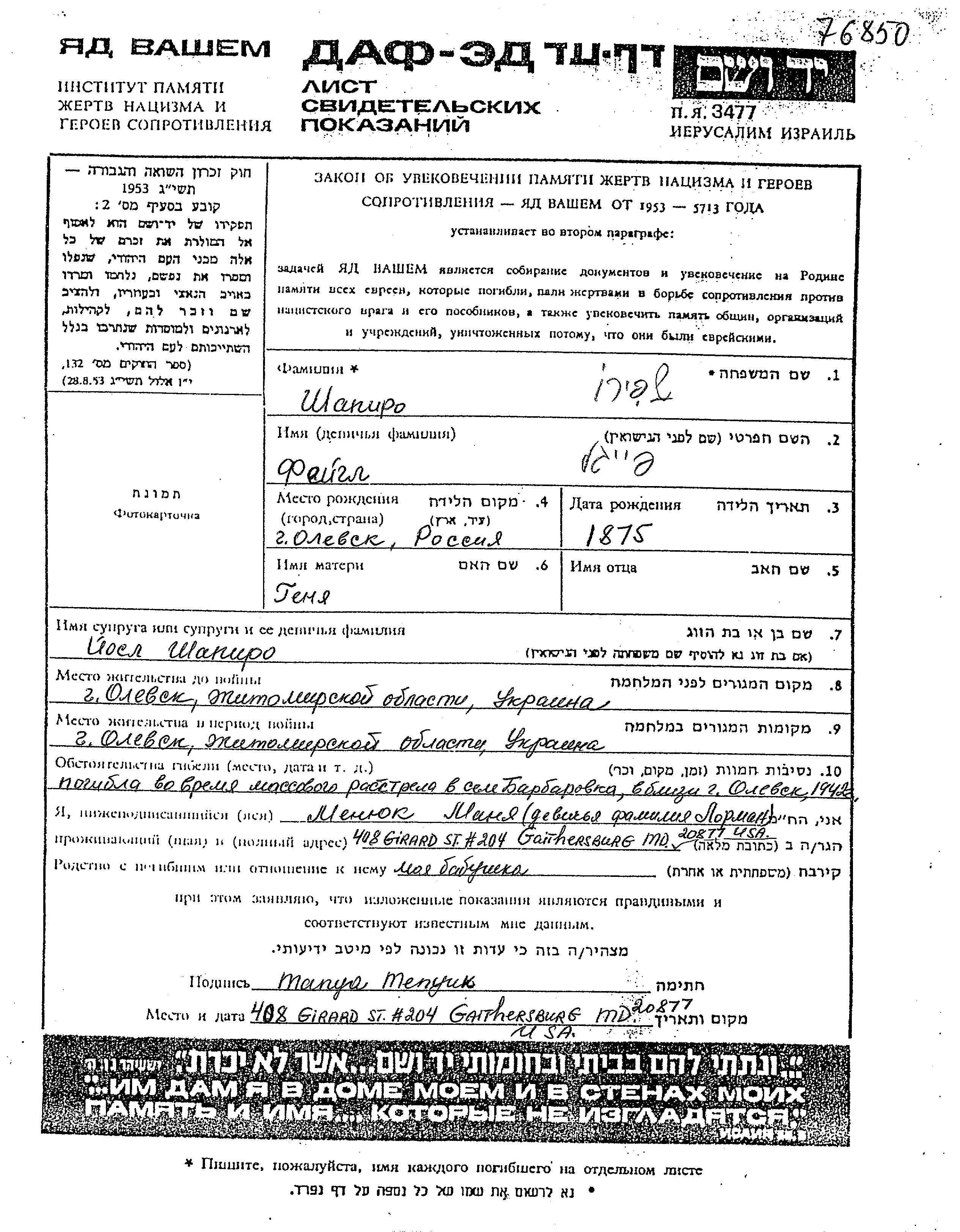 Шапиро Файгель 1875 Олевск, Украина (СССР) Лист свидетельских показаний