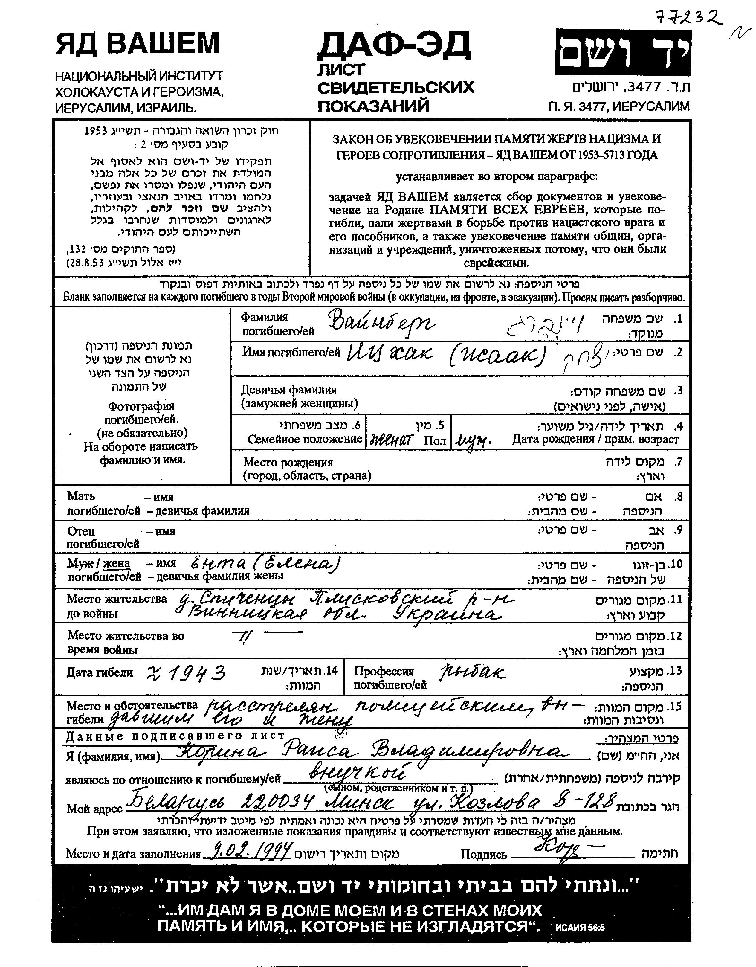 Вайнберг Ицхак Спичинцы, Украина (СССР) Лист свидетельских показаний
