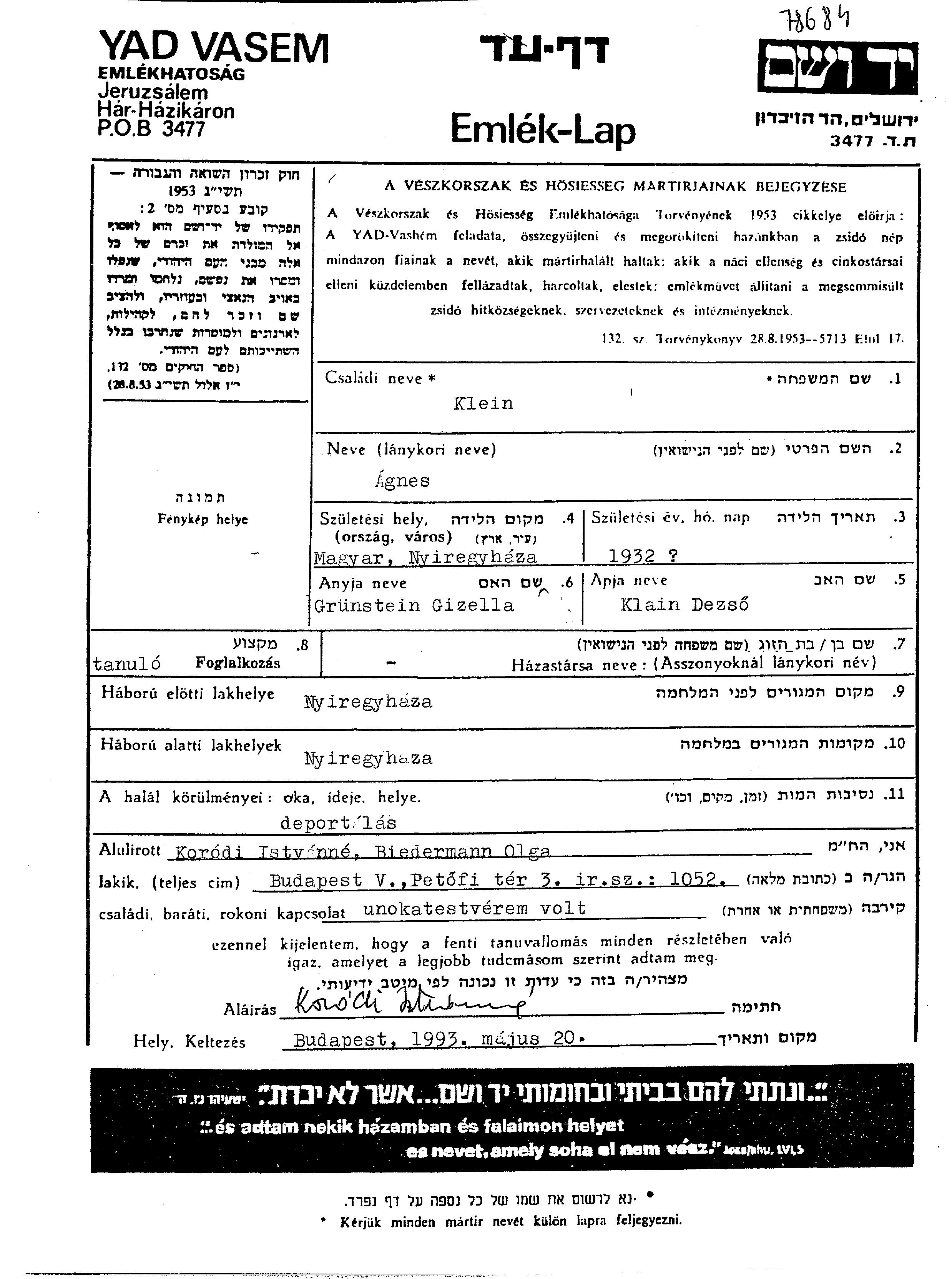 Клейн Агнеш 1932 Ньиредьхаза, Венгрия Лист свидетельских показаний