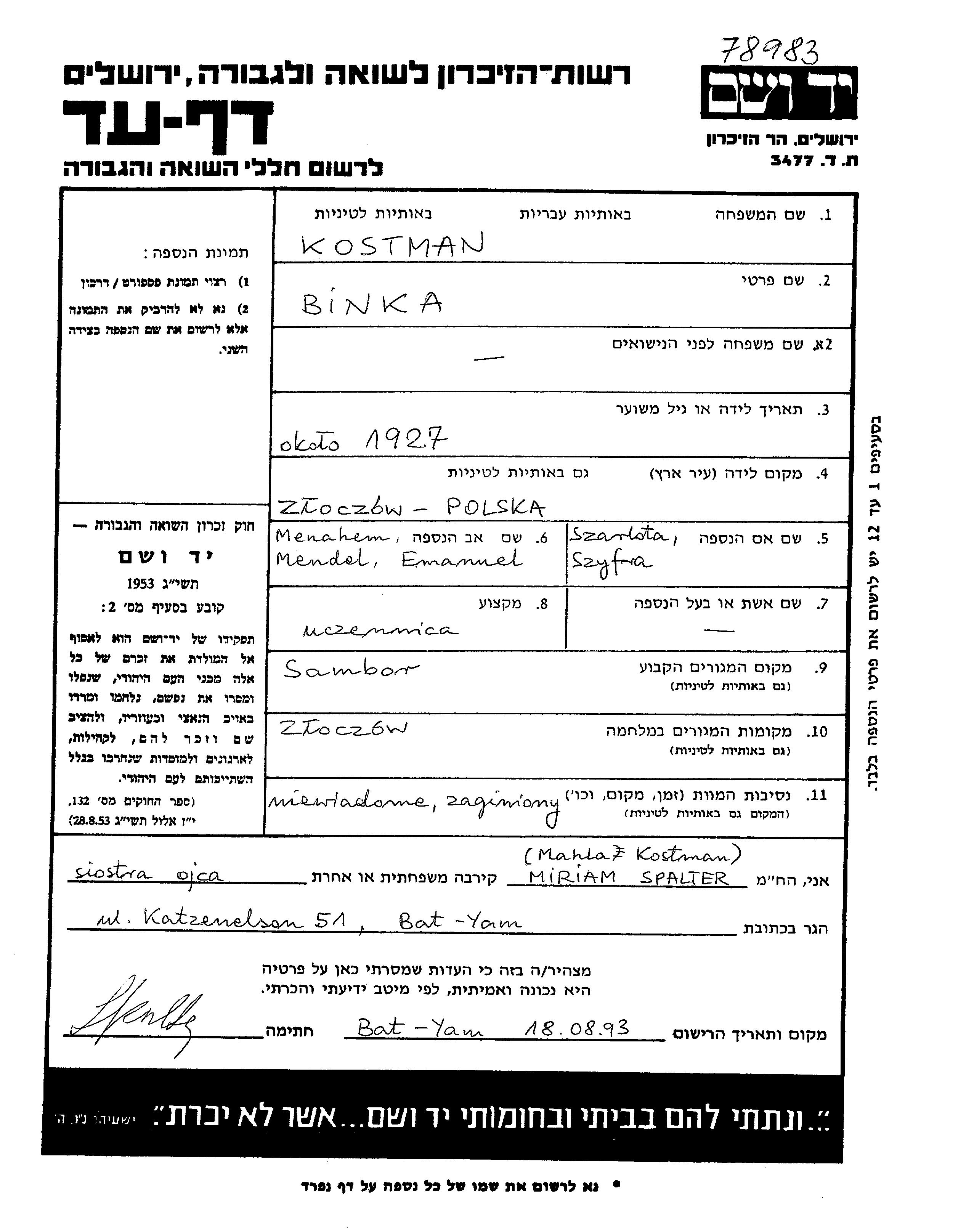 Бинка Костман, место рождения: Злочов, Польша. Отец: Мендель Эмануэль Менахем, mать:Шифра Шарлота. Ученик / ученица. Ребенок. Место жительства до войны: Самбор, Польша. Место во время войны: Злочов, Польша.