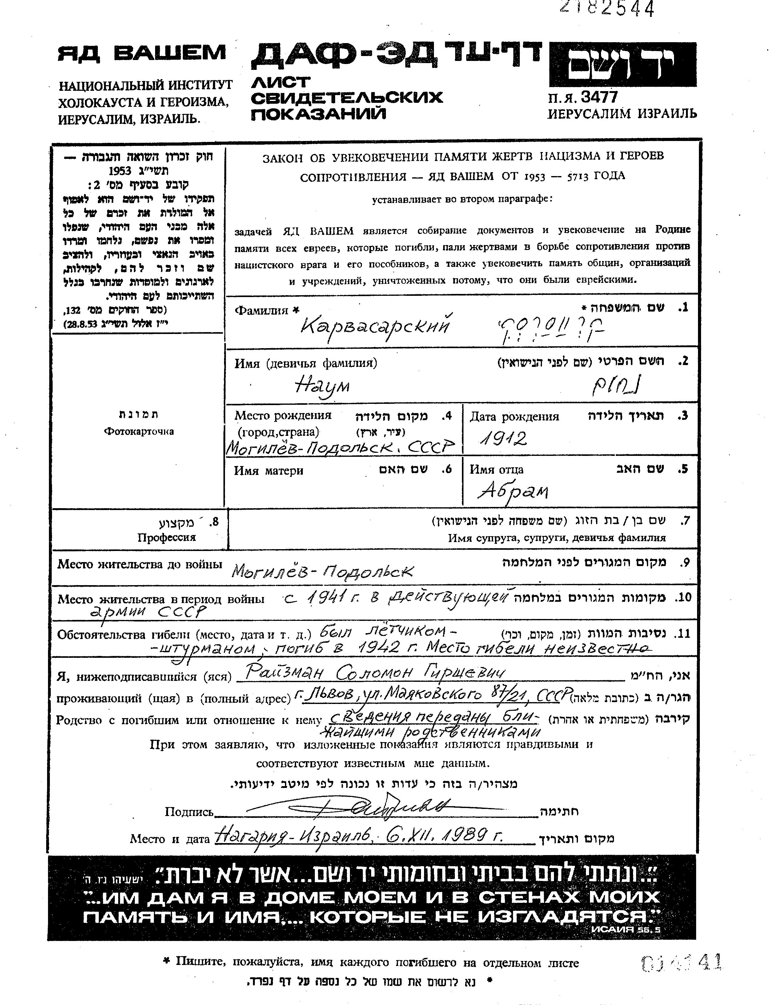 Наум Карвасарский, место рождения: Могилёв-Подольский, Украина (СССР). Отец: Абрам. Пилот. Место жительства до войны: Могилёв-Подольский, Украина (СССР). Место во время войны: Вооруженные силы Советского Союза. Наум погиб на военной службе. место смерти: неизвестно в 1942.