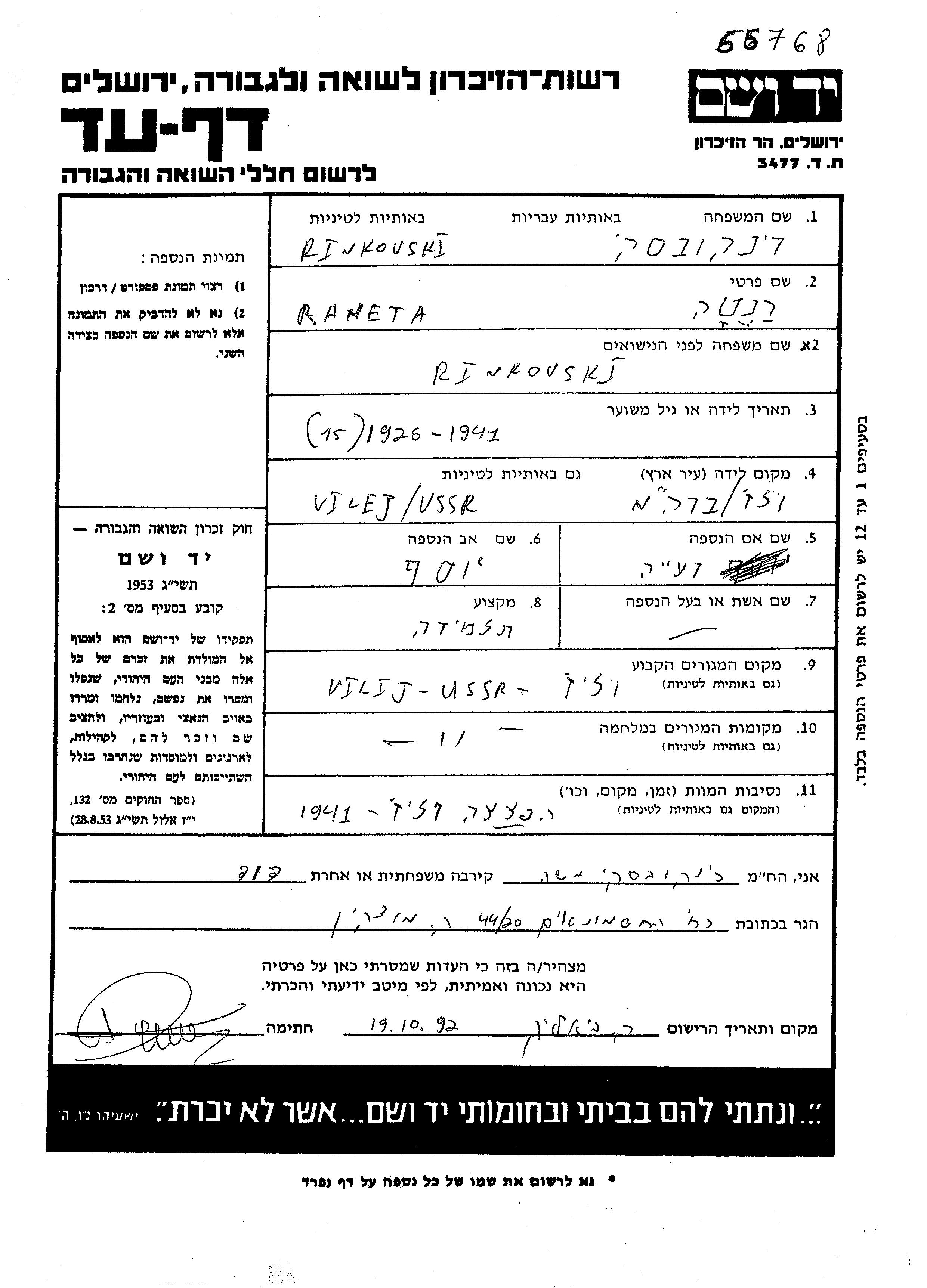 Яд Вашем - Листы свидетельских показаний Мемориального фонда