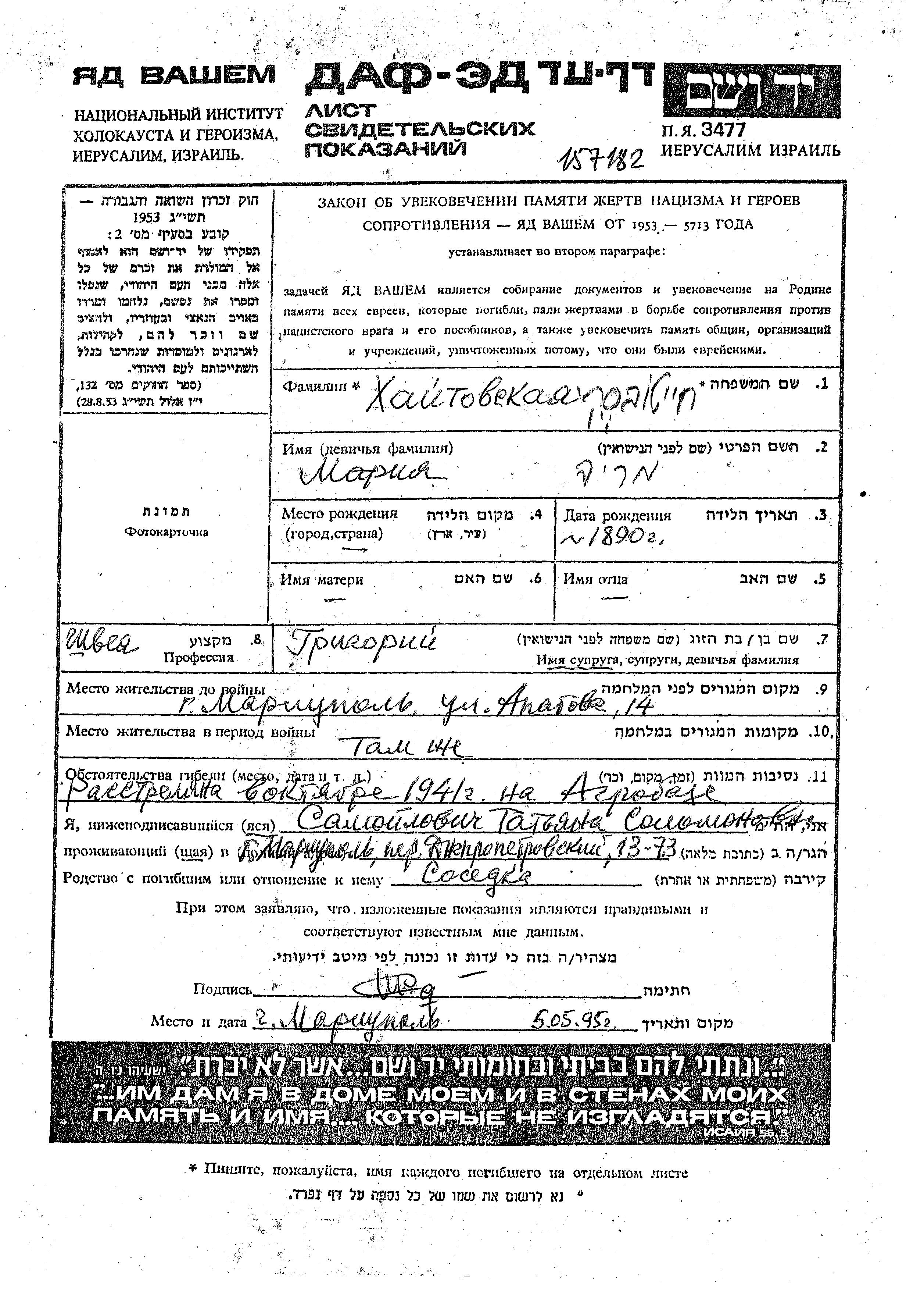 Хаитовский Мария 1890 Мариуполь, Украина (СССР) Лист свидетельских показаний