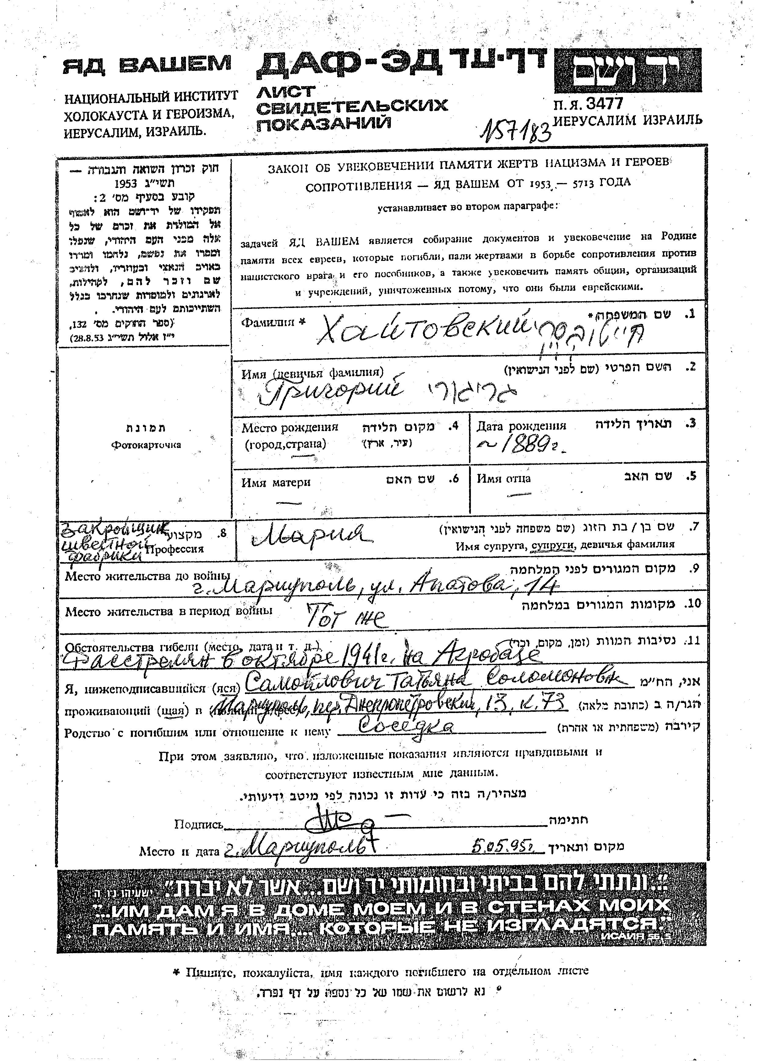 Хаитовский Григорий 1889 Мариуполь, Украина (СССР) Лист свидетельских показаний