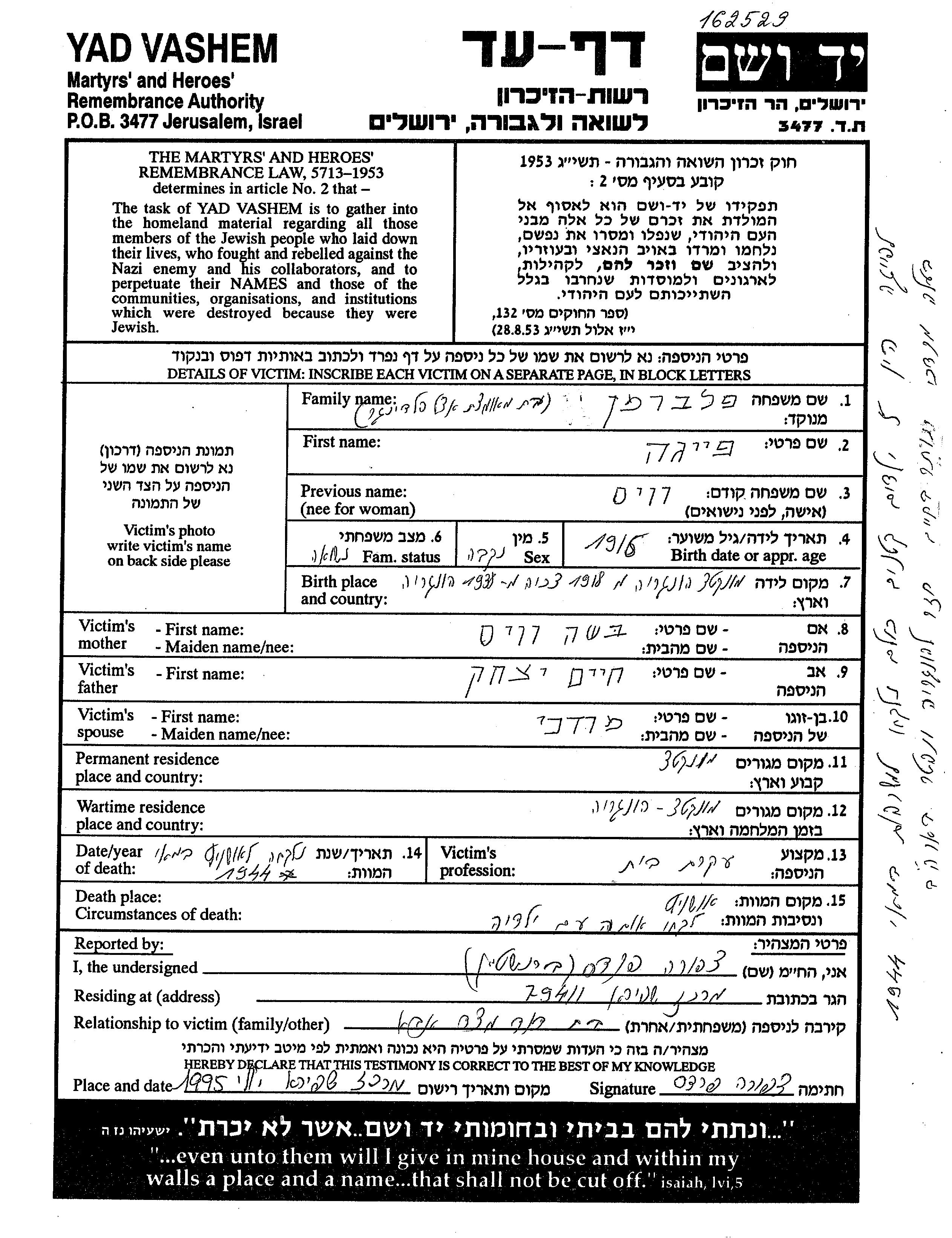 Фельберман Фейга 1916 Мункач, Чехословакия Лист свидетельских показаний