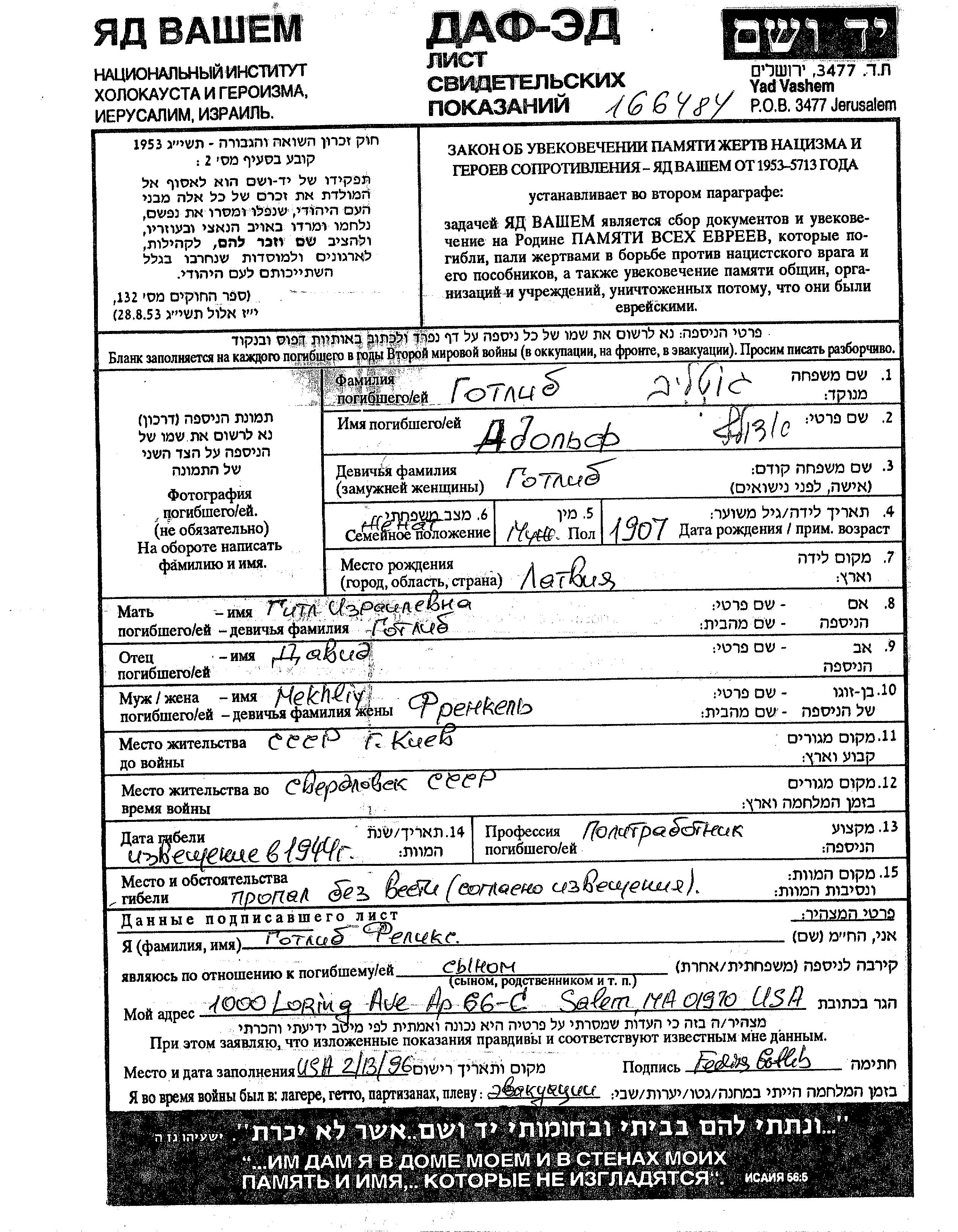 Адольф Готлиб, место рождения: Латвия. Отец: Давид, mать:Гитл. Партийный функционер. Женат / замужем. Место жительства до войны: Киев, Украина (СССР). Место во время войны: Вооруженные силы Советского Союза.