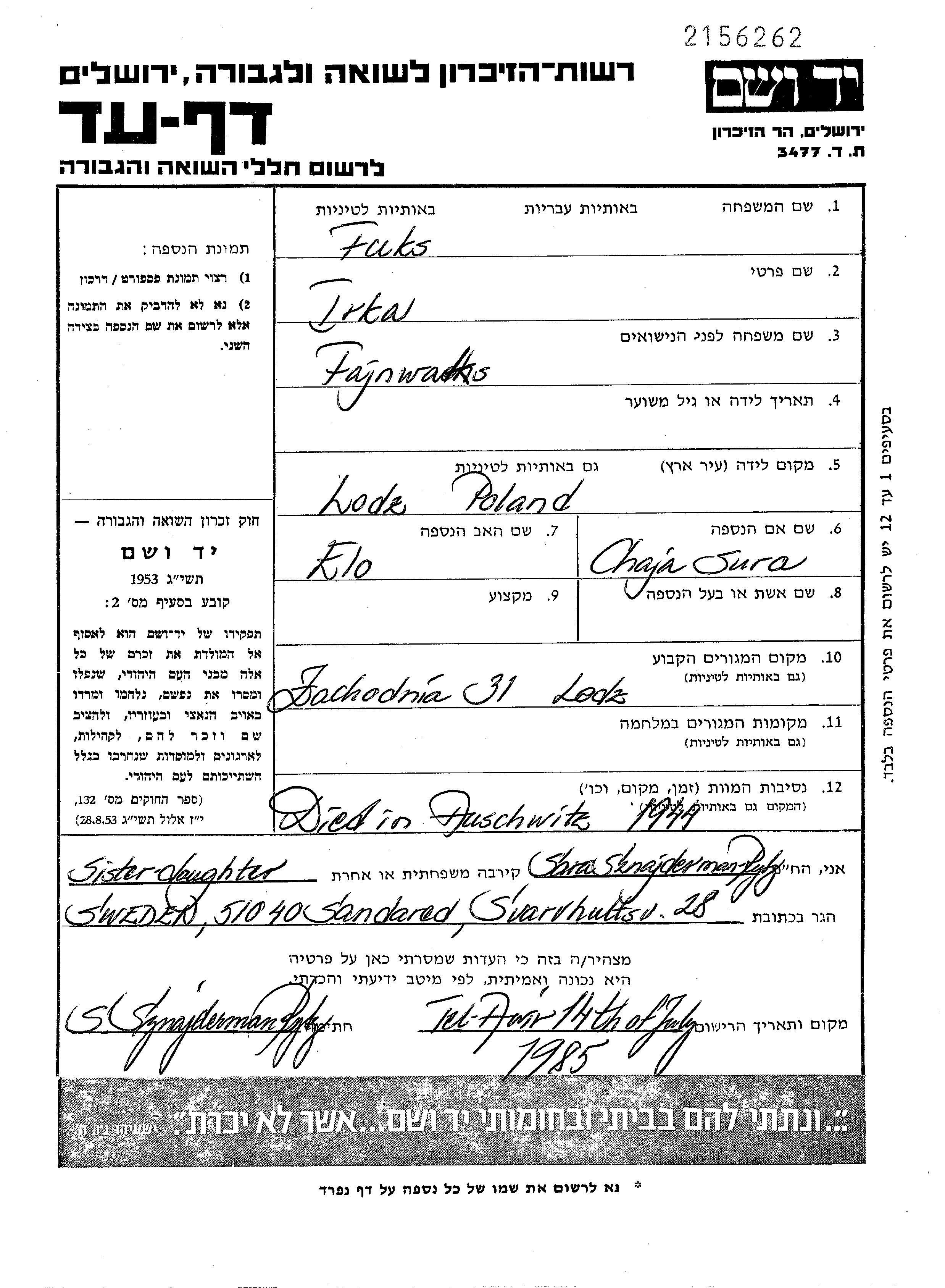 Фукс Ирка Лодзь, Польша Лист свидетельских показаний