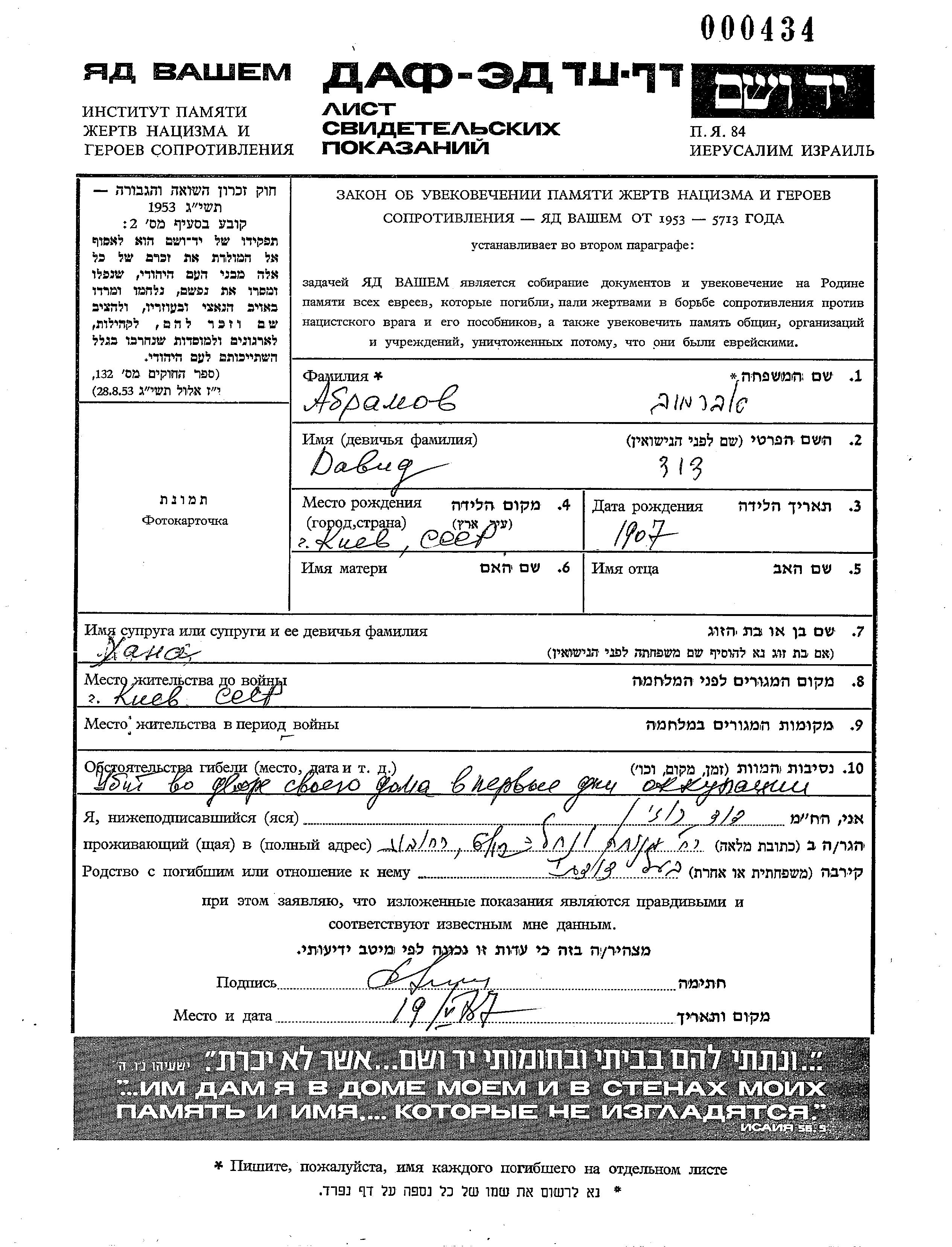 Абрамов Давид 1907 Киев, Украина (СССР) Лист свидетельских показаний