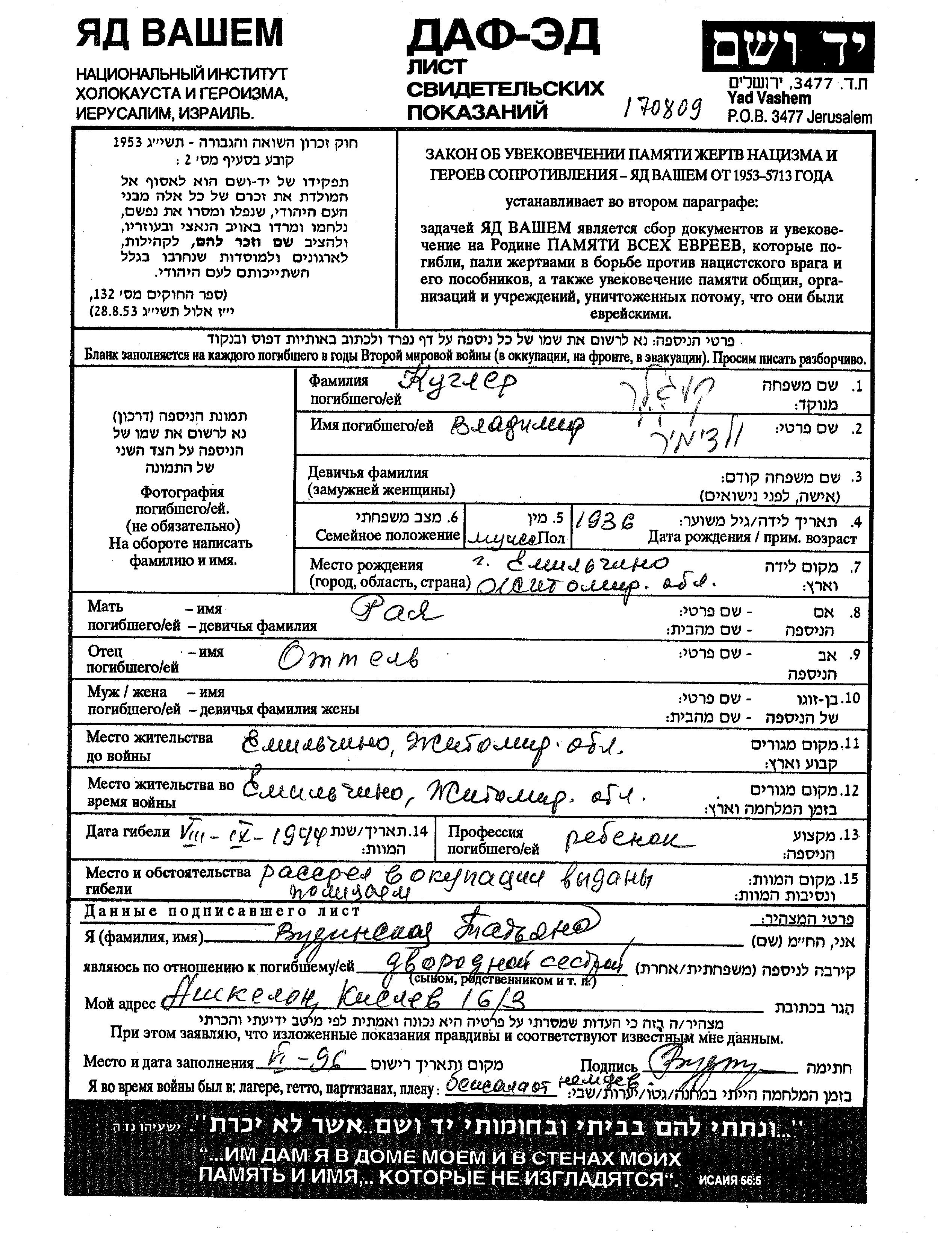 Яд Вашем - Листы свидетельских показаний Мемориального фонда