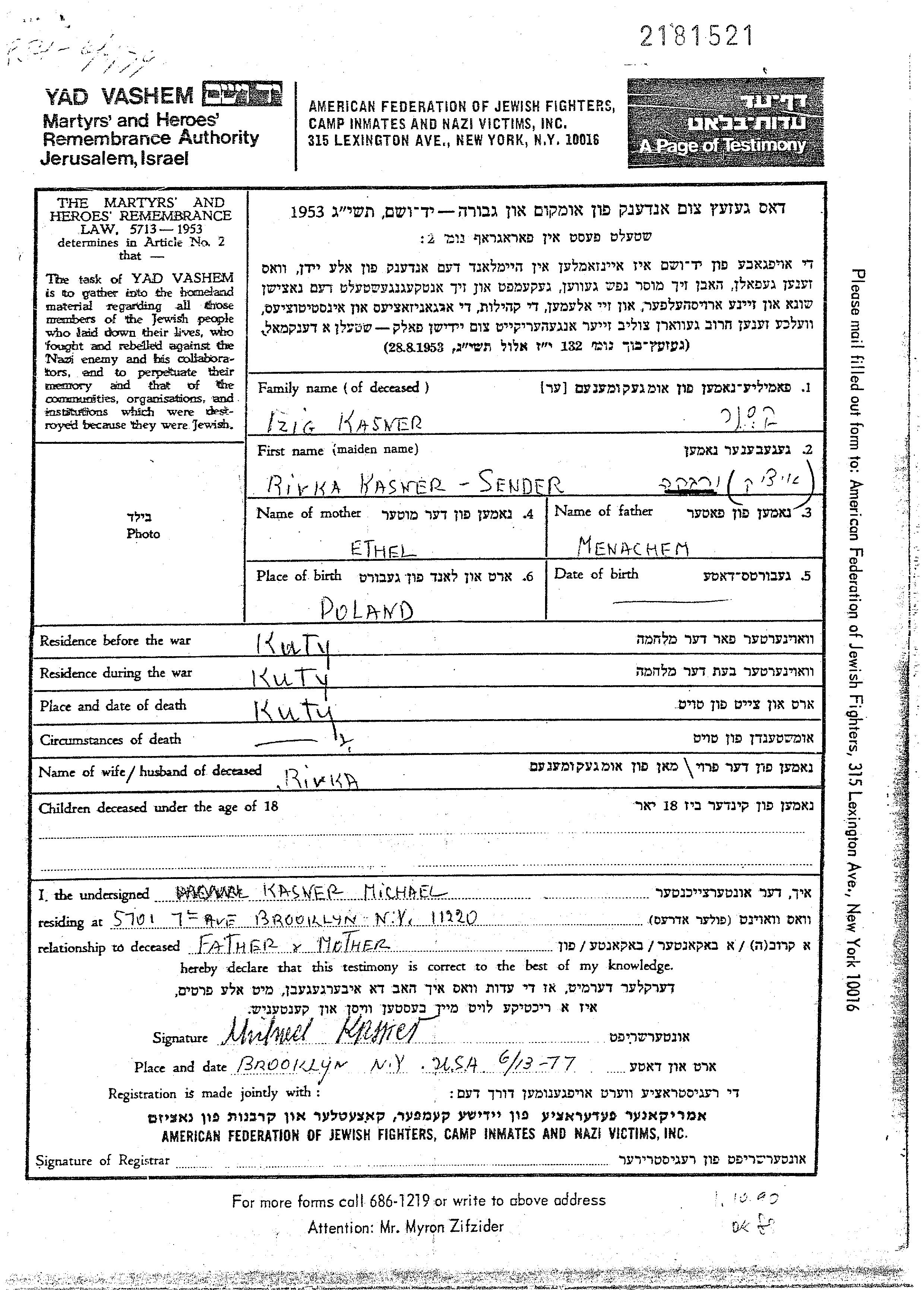 Каснер Ривка Куты, Польша Лист свидетельских показаний