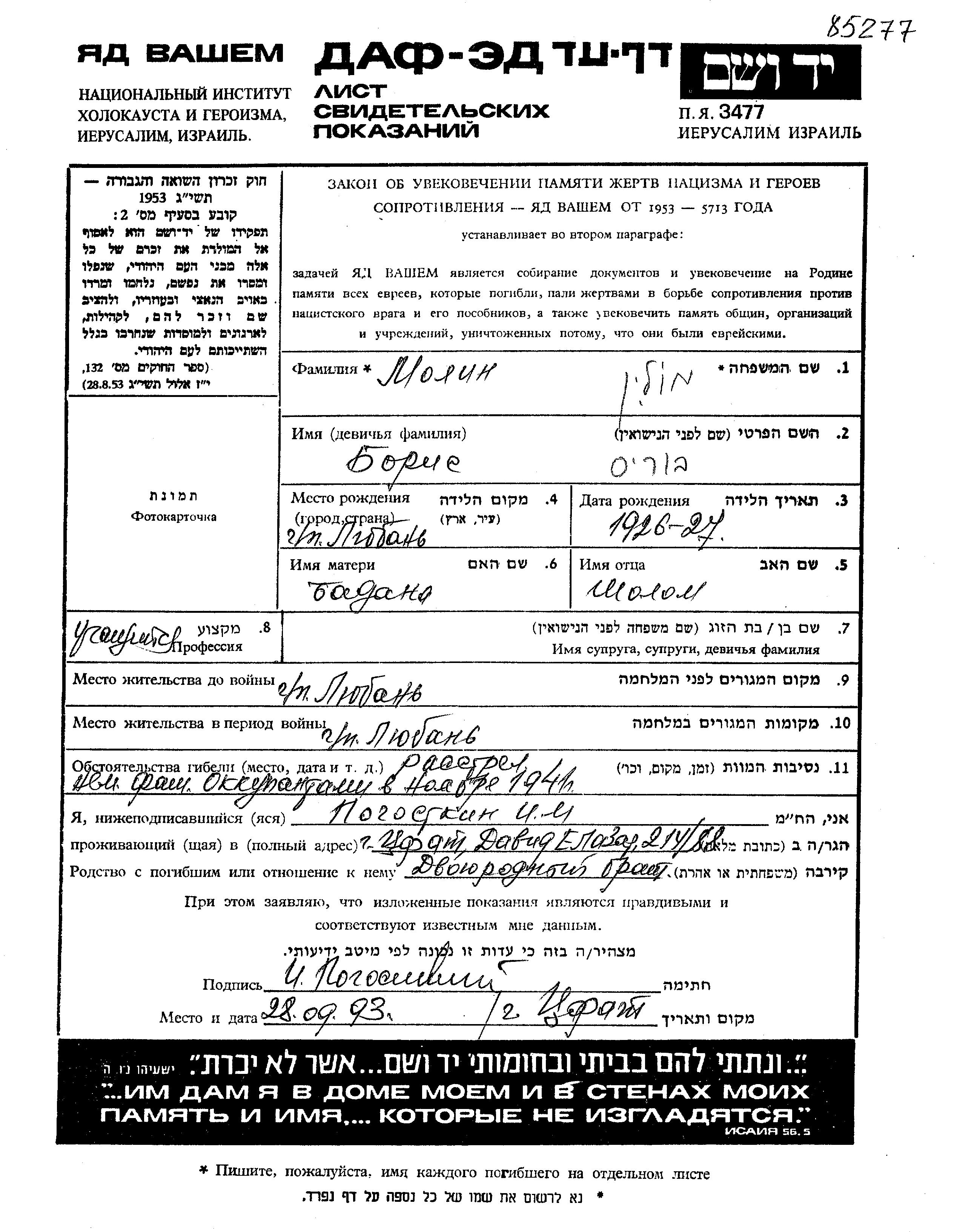Молин Борис 1926 Любань, Белоруссия (СССР) Лист свидетельских показаний