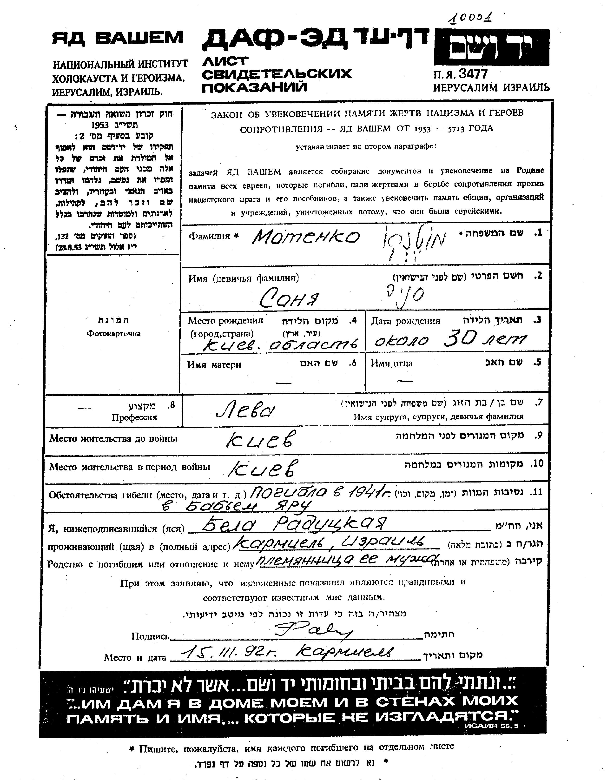 Мотенко Саня Киев, Украина (СССР) Лист свидетельских показаний