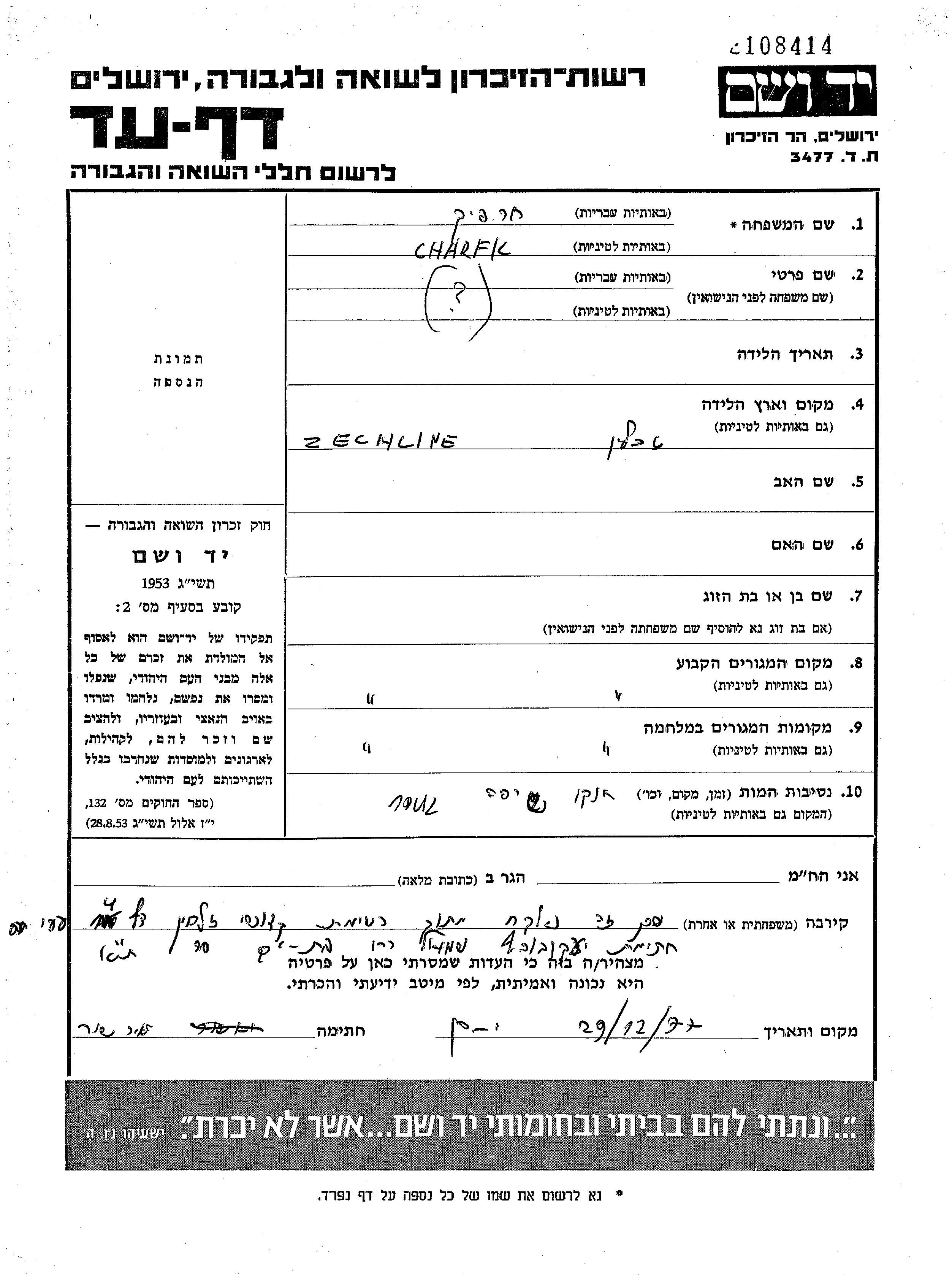 Харфик Имя неизвестно Жихлин, Польша Лист свидетельских показаний