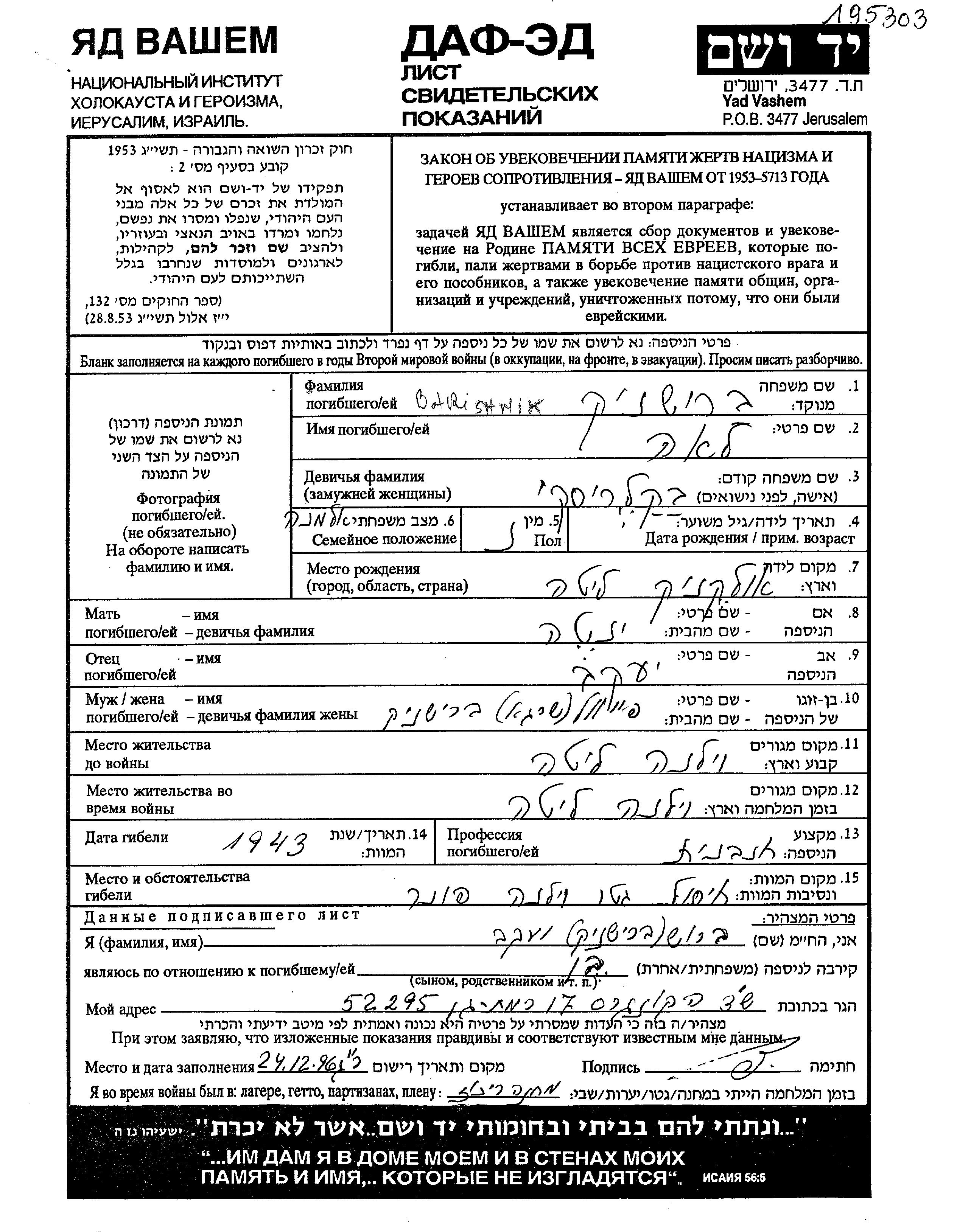 Яд Вашем - Листы свидетельских показаний Мемориального фонда