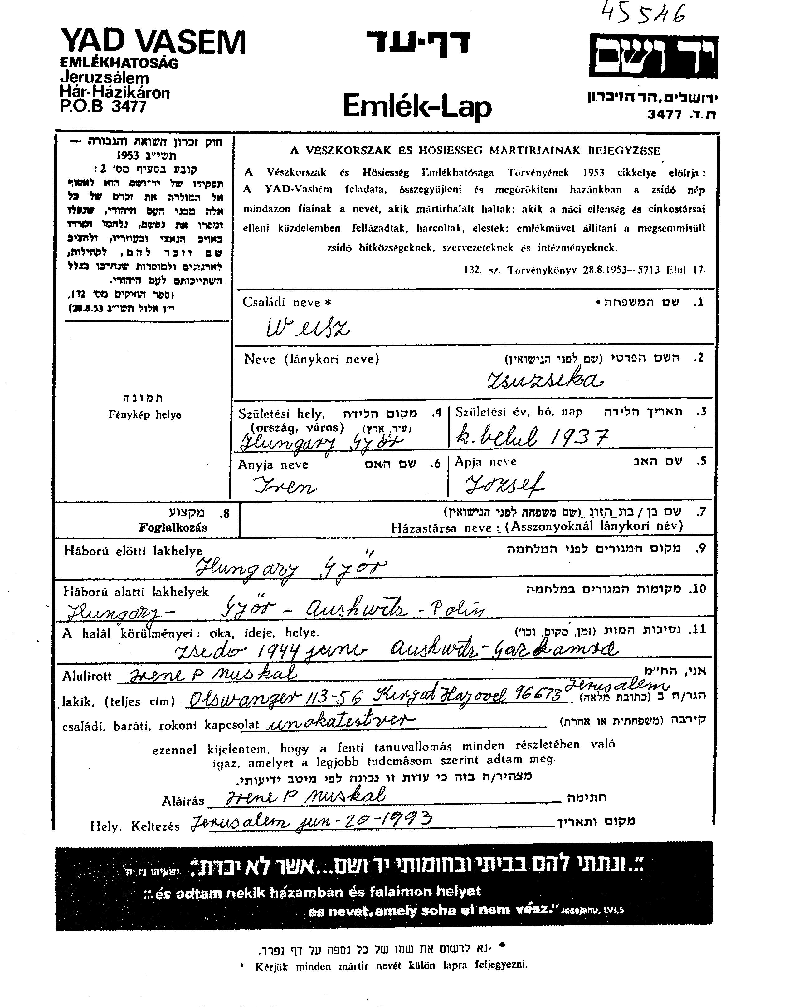 Жужика Вейс, место рождения: Дьёр, Венгрия. Отец: Йозеф, mать:Ирен. Ребенок. Место жительства до войны: Дьёр, Венгрия. Место во время войны: Дьёр, Венгрия.
