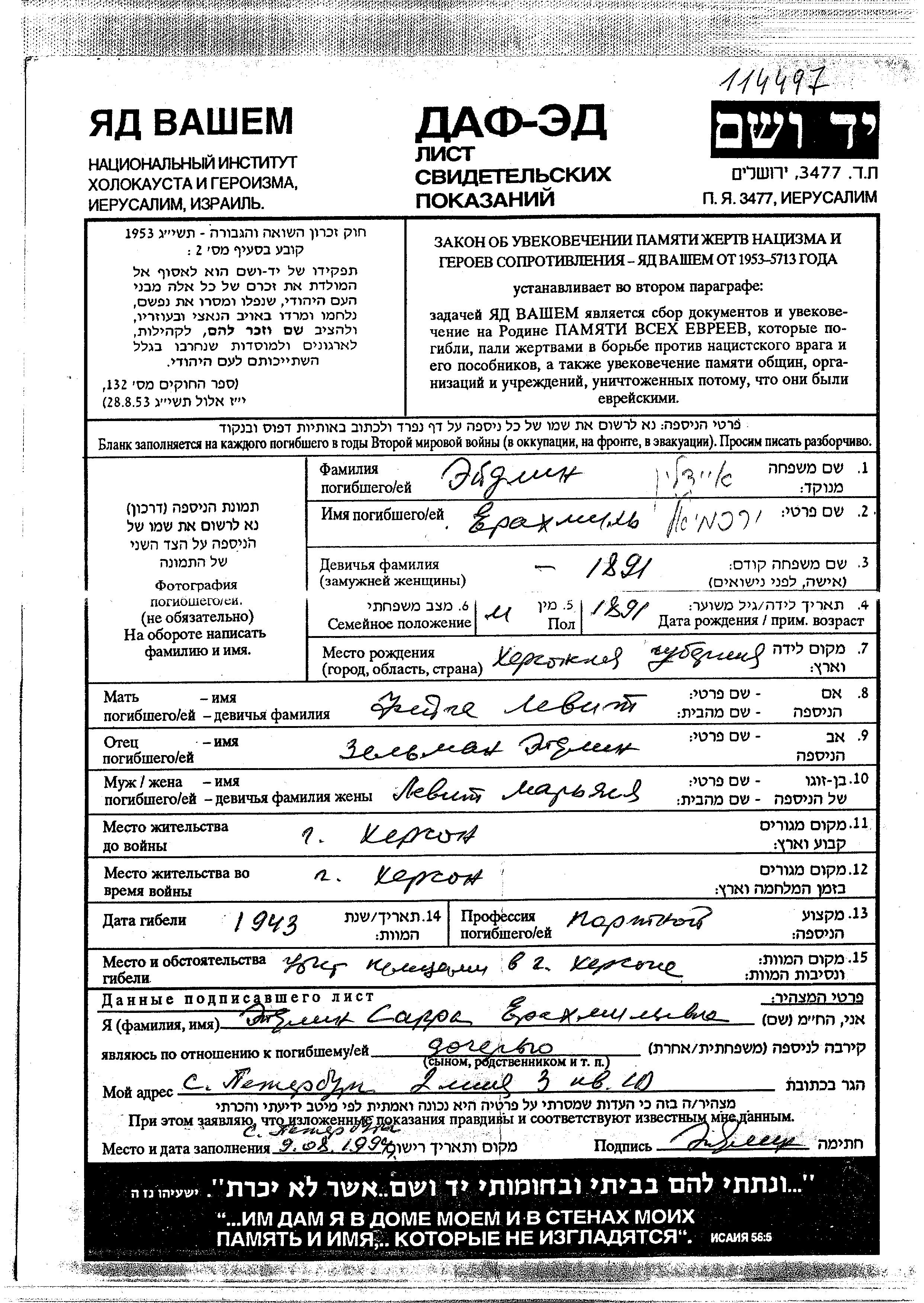 Яд Вашем - Листы свидетельских показаний Мемориального фонда