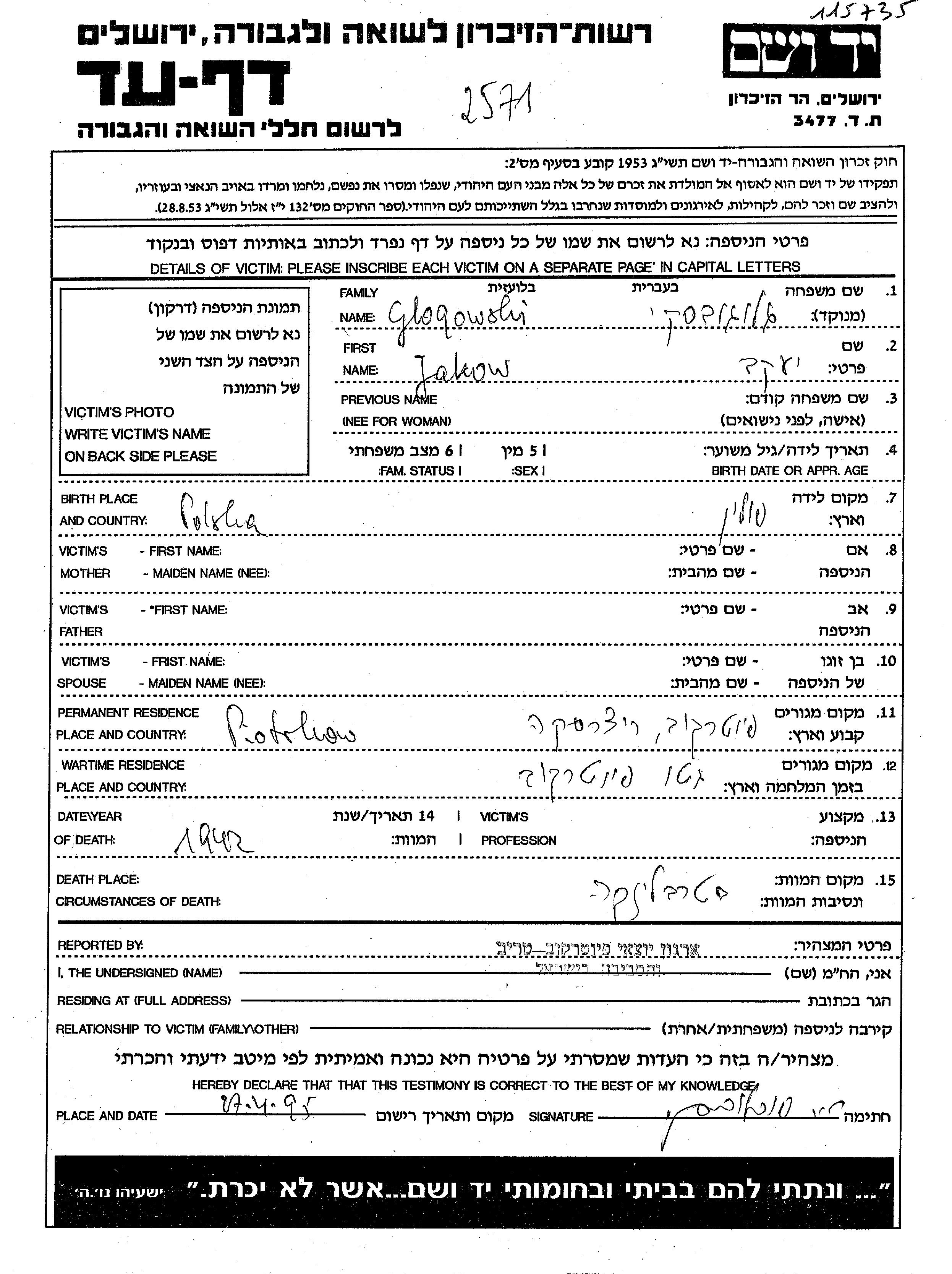 Глоговски Яков Пётркув, Польша Лист свидетельских показаний