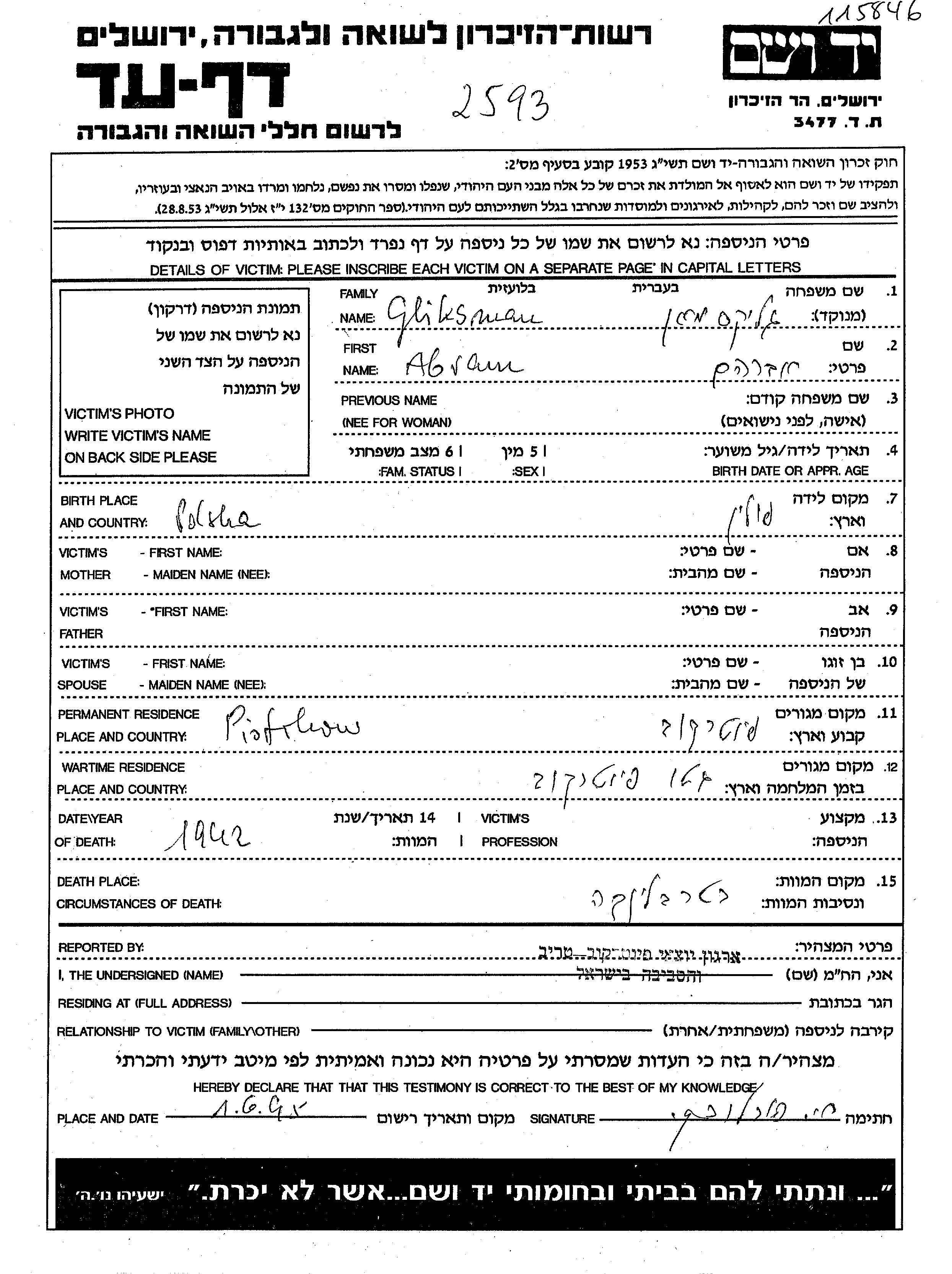 Абрам Гликсман, место рождения: Польша. Место жительства до войны: Пётркув, Польша. Место во время войны: Пётркув, Польша.