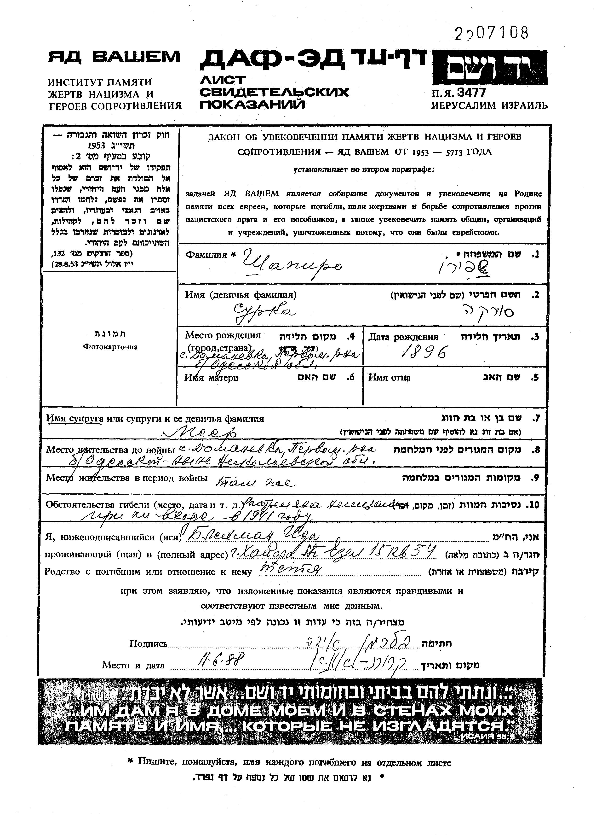 Шапиро Сурка Доманёвка, Украина (СССР) Лист свидетельских показаний