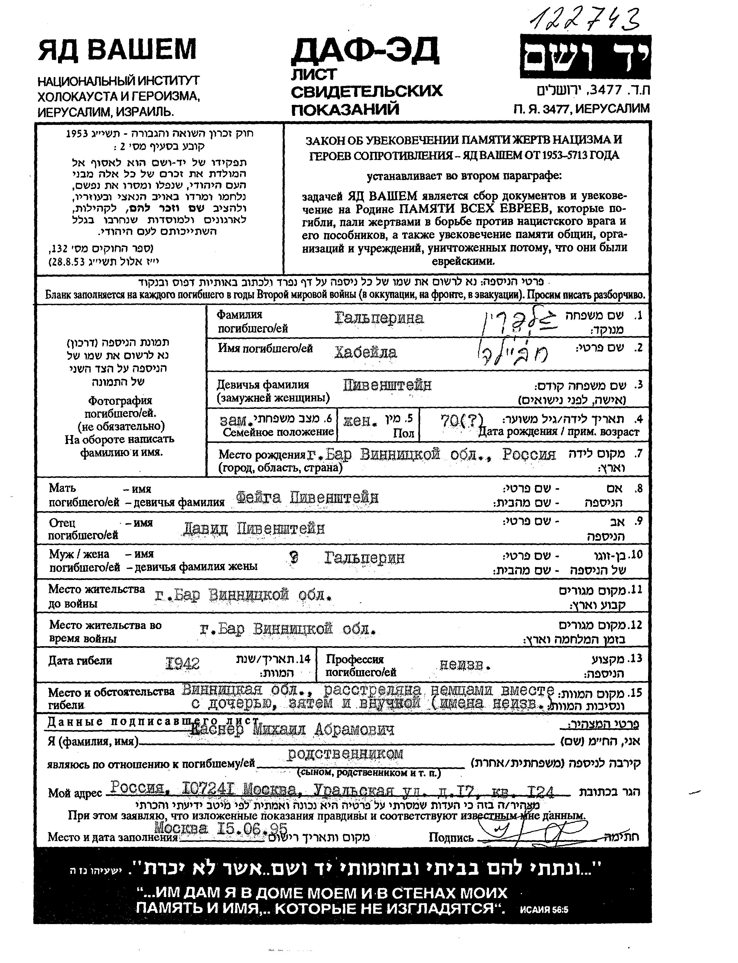 Гальперин Khabeila Хабейла 1872 Бар, Украина (СССР) Лист свидетельских показаний