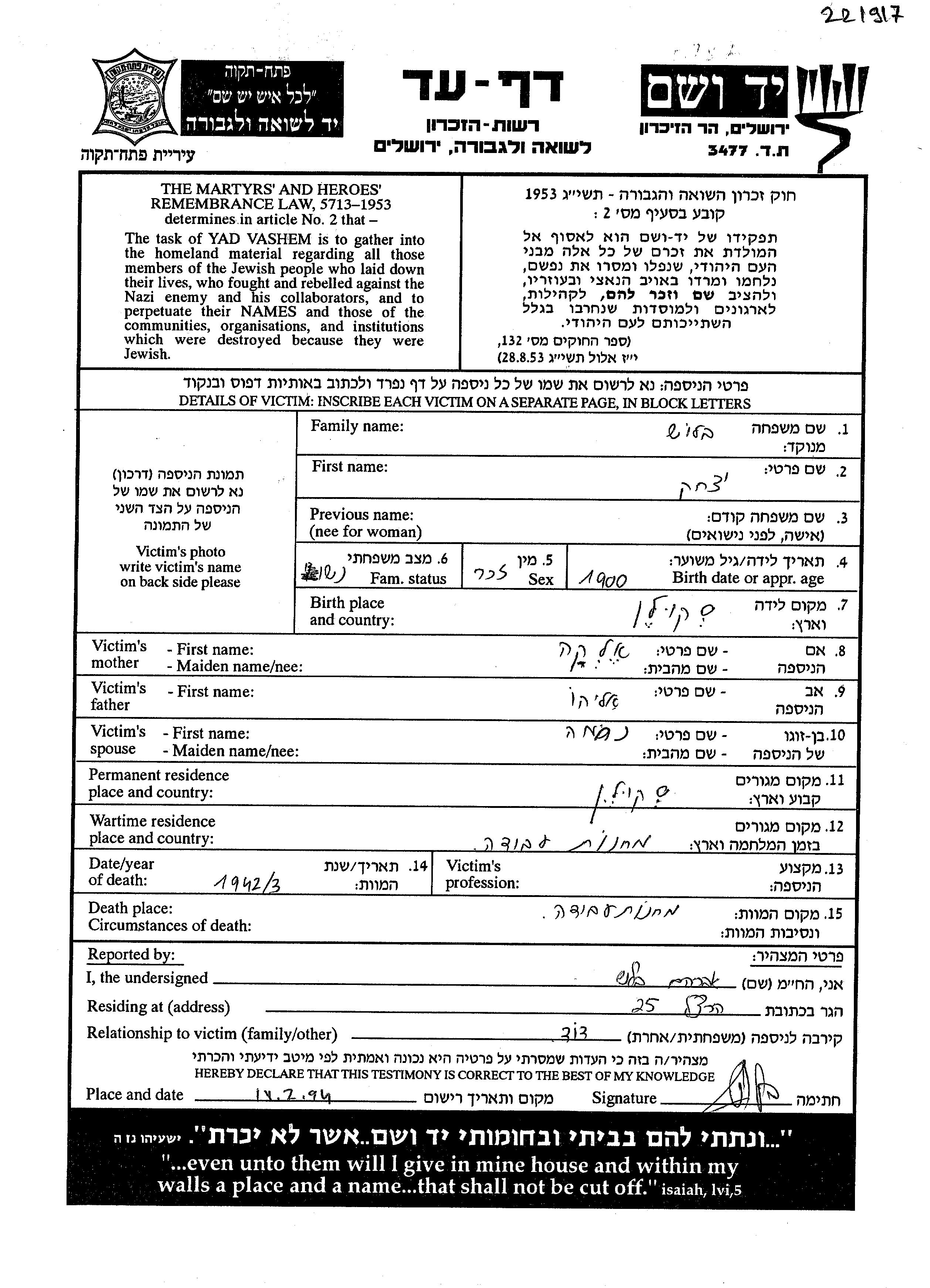 Яд Вашем - Листы свидетельских показаний Мемориального фонда
