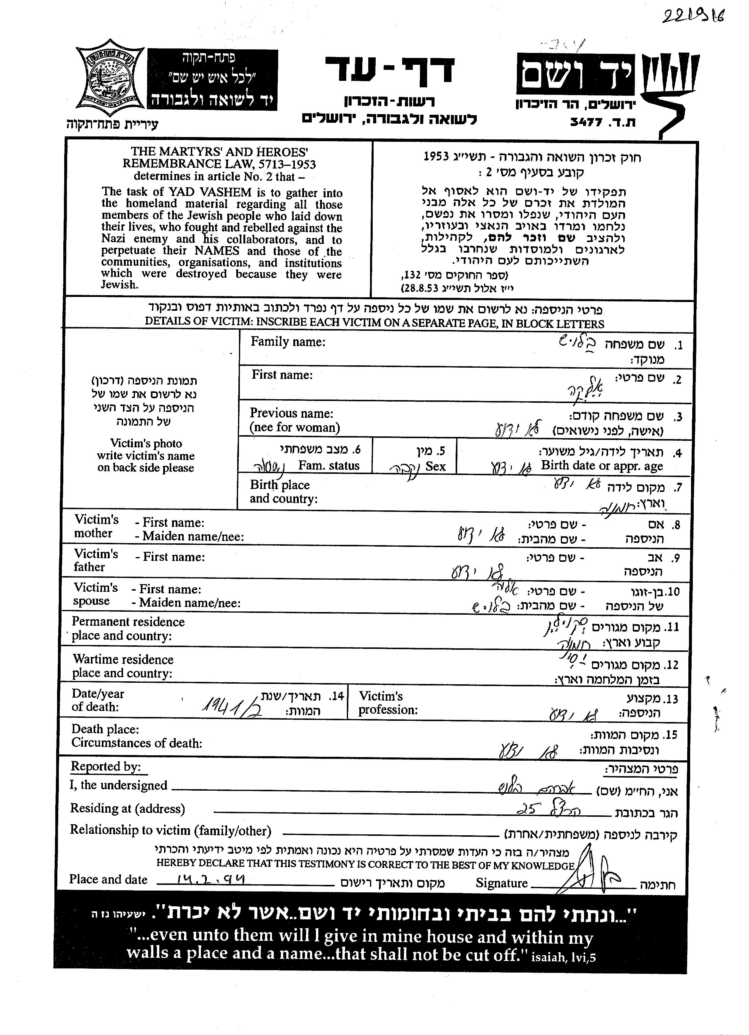 Яд Вашем - Листы свидетельских показаний Мемориального фонда