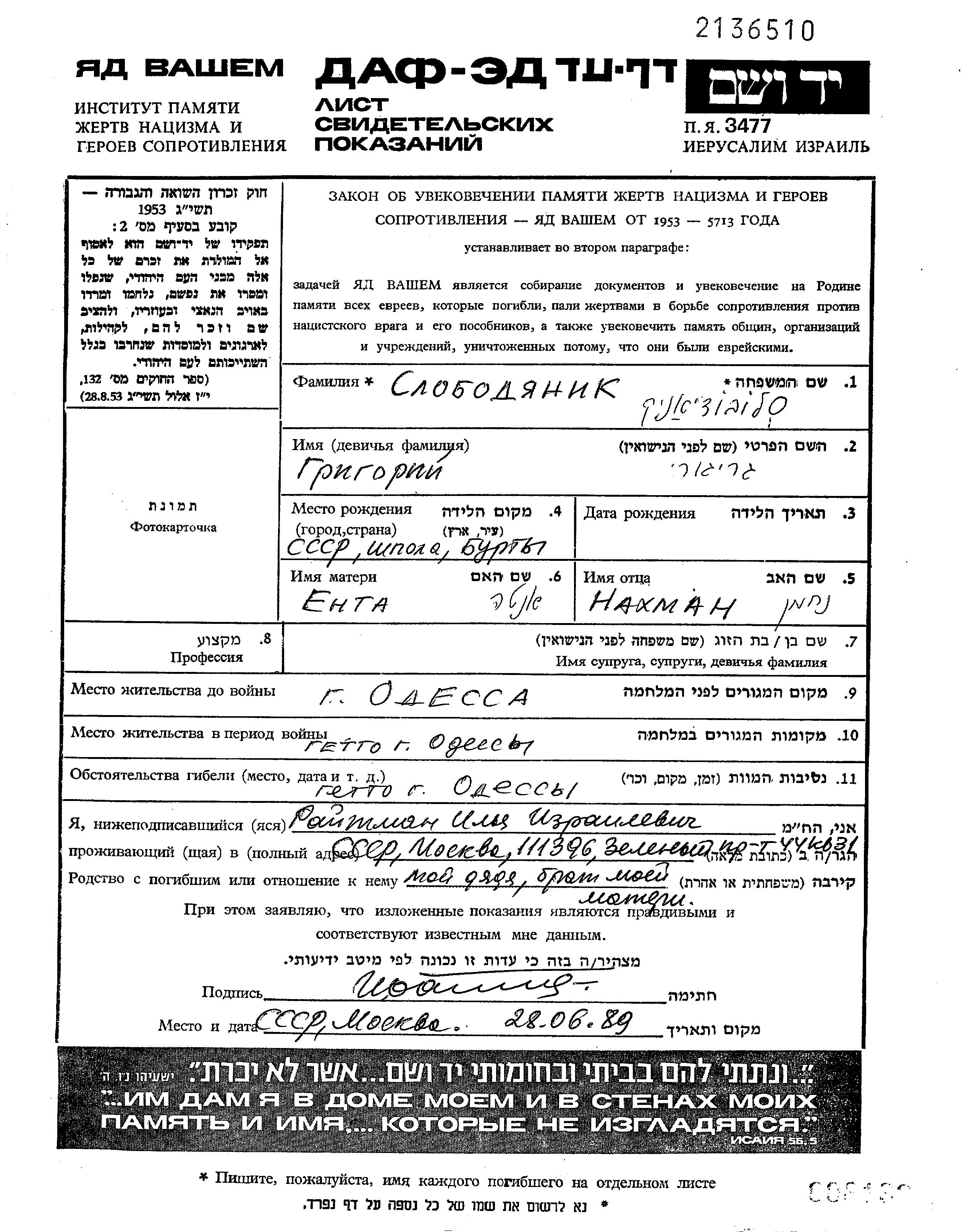 Слободяник Григорий Одесса, Украина (СССР) Лист свидетельских показаний