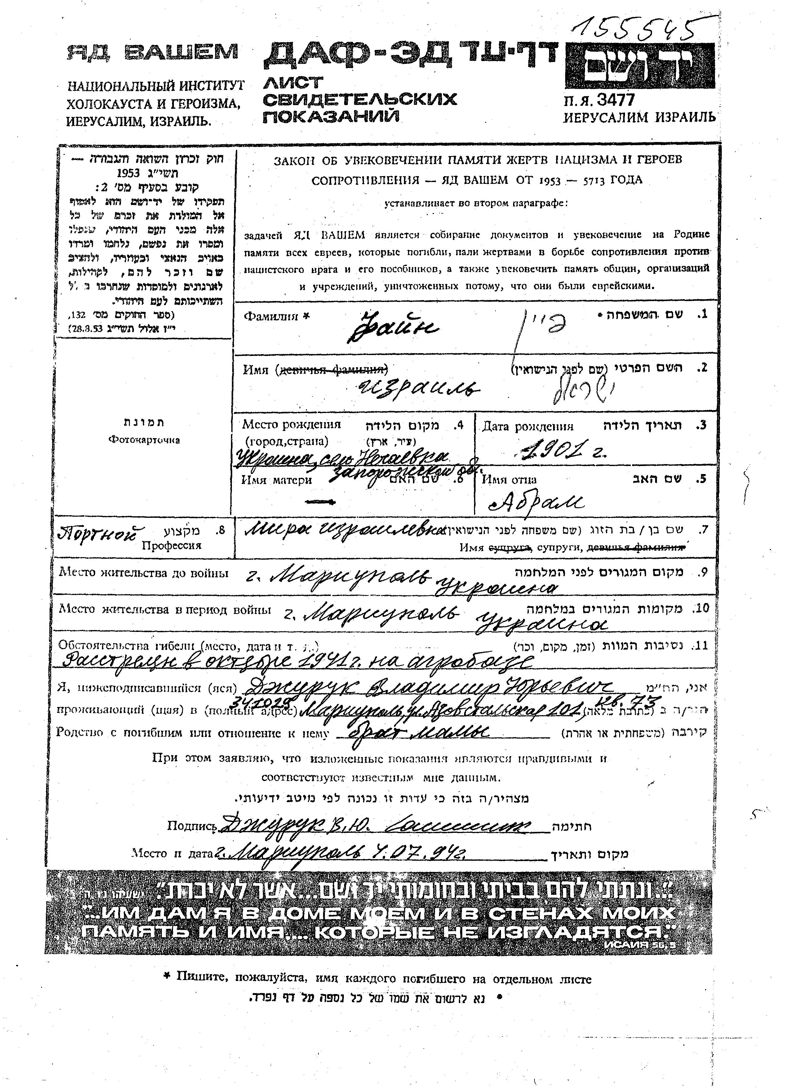 Файн Израиль 1901 Мариуполь, Украина (СССР) Лист свидетельских показаний