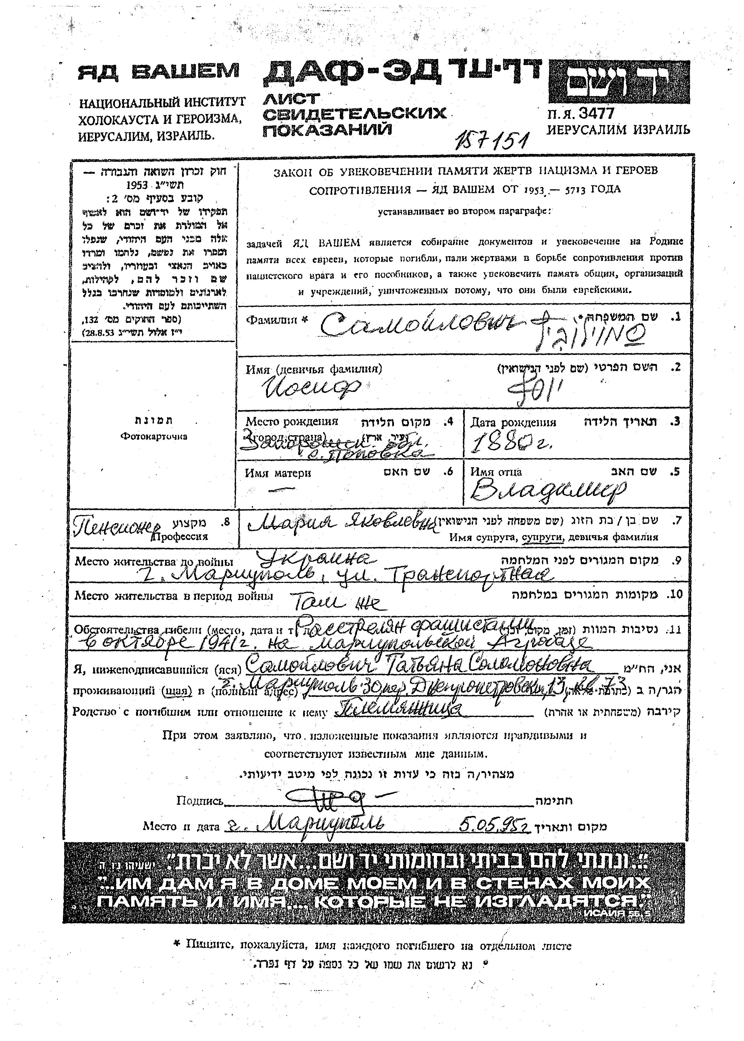 Самойлович Иосиф 1880 Мариуполь, Украина (СССР) Лист свидетельских показаний