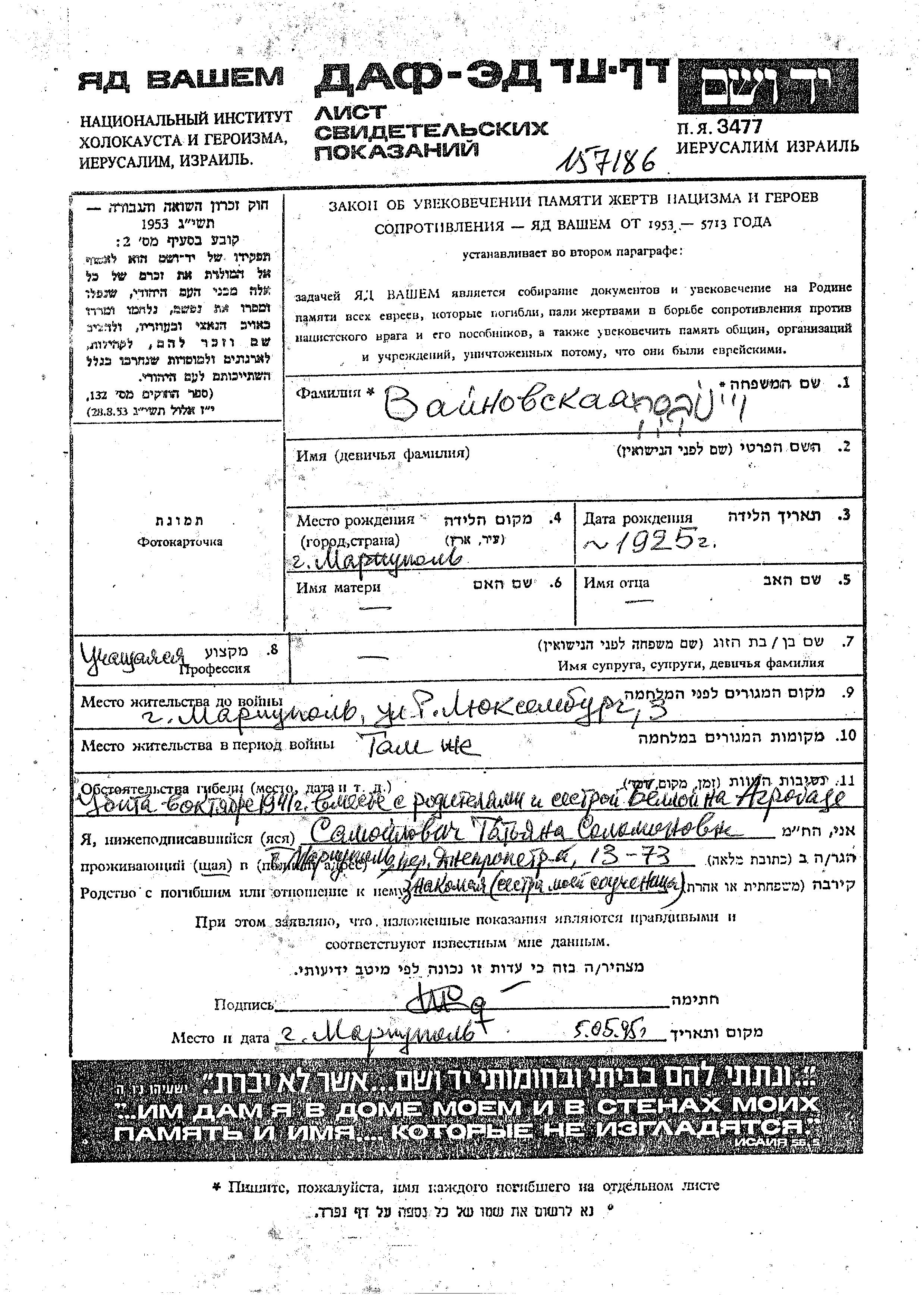 Вайновский Имя неизвестно 1925 Мариуполь, Украина (СССР) Лист свидетельских показаний