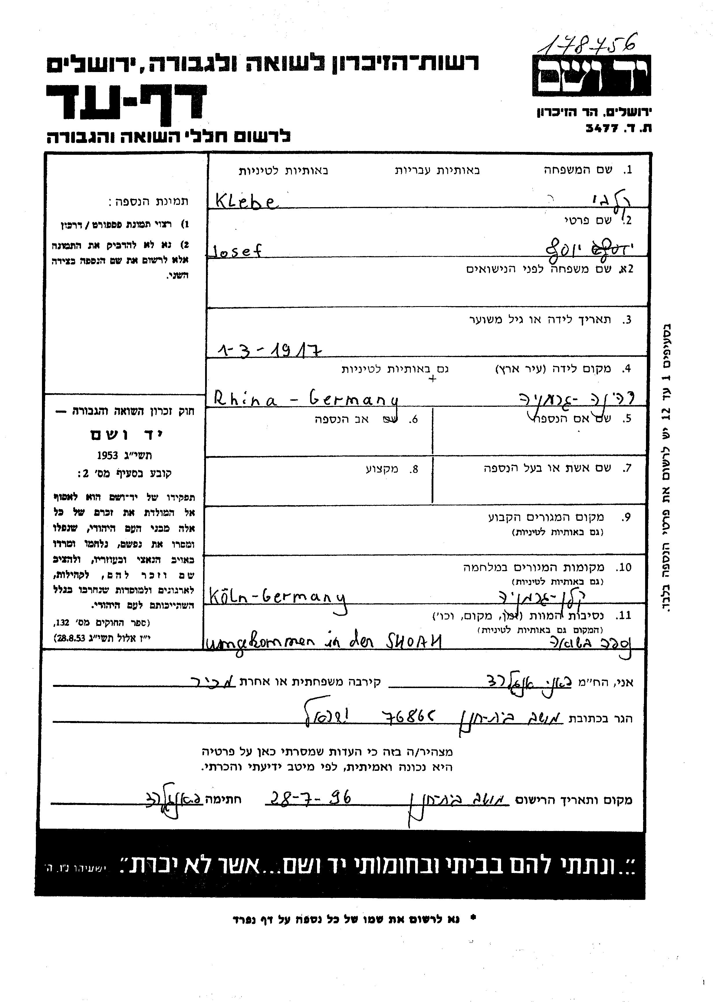Йосеф Клебе, место рождения: Рина, Германия. Холост / не замужем. Место жительства до войны: Германия. Место во время войны: Кёльн, Германия.