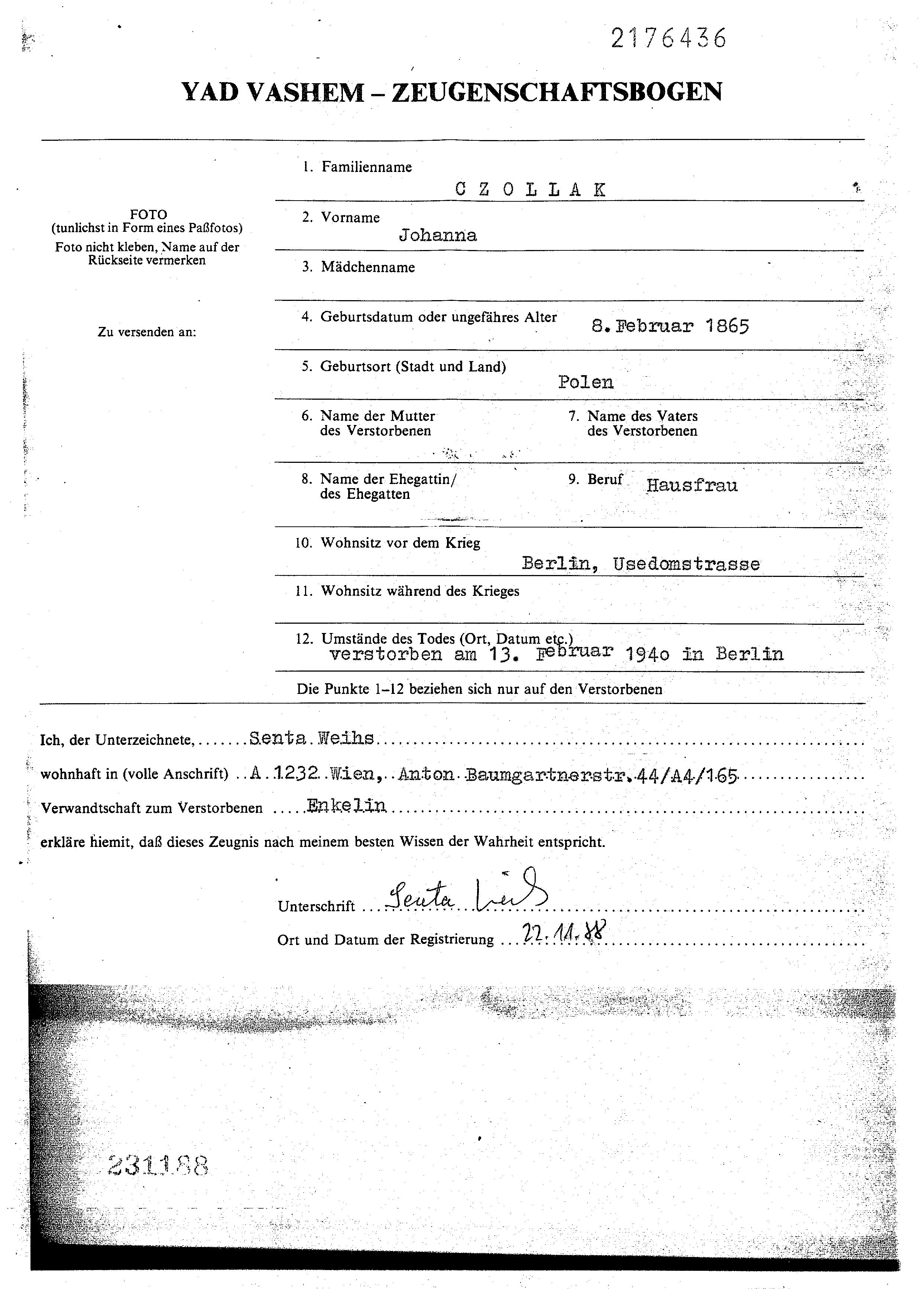 Йоханна Чоллак, место рождения: Польша. Домохозяйка. Место жительства до войны: Берлин, Германия. Место во время войны: Берлин, Германия.