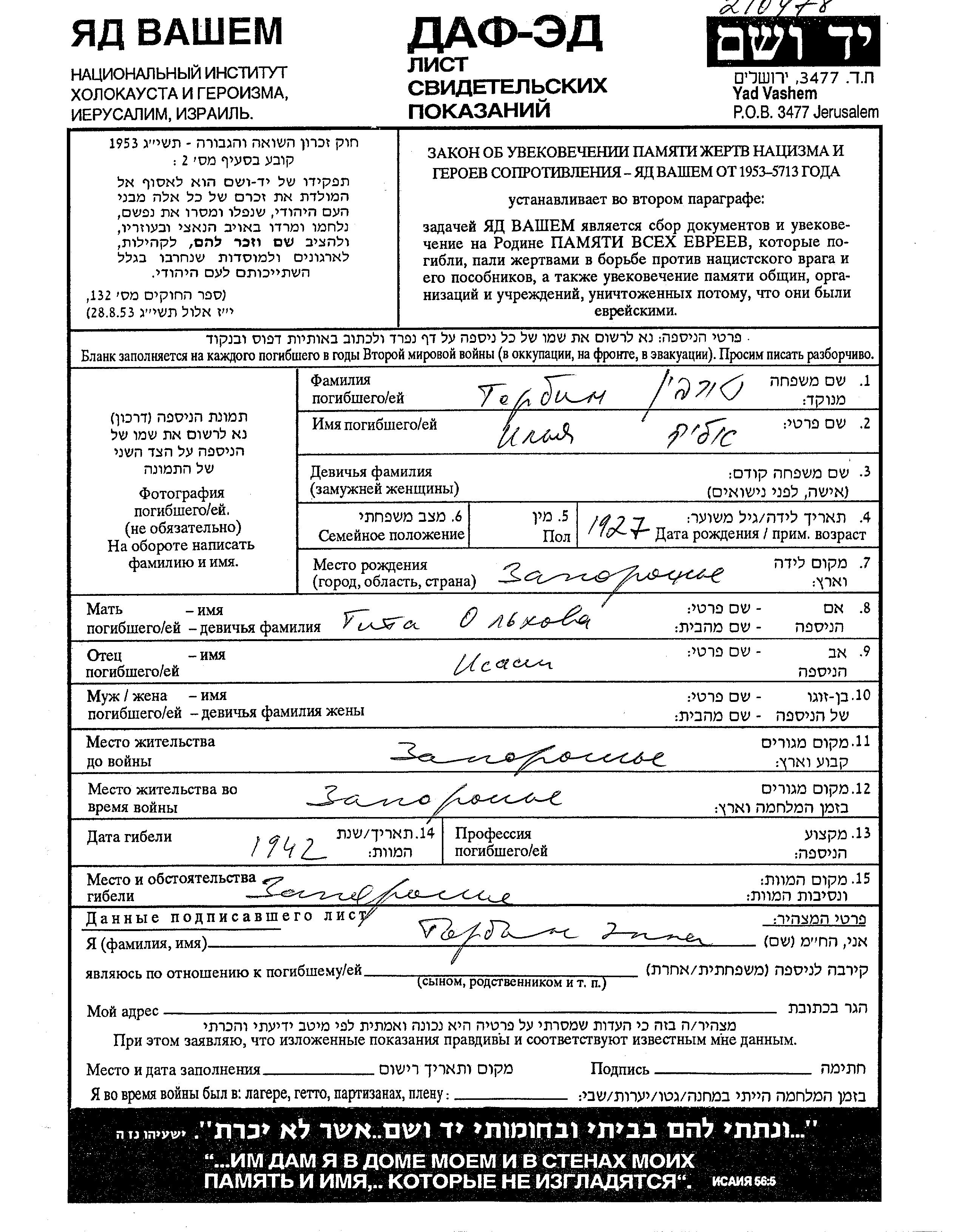 Яд Вашем - Листы свидетельских показаний Мемориального фонда