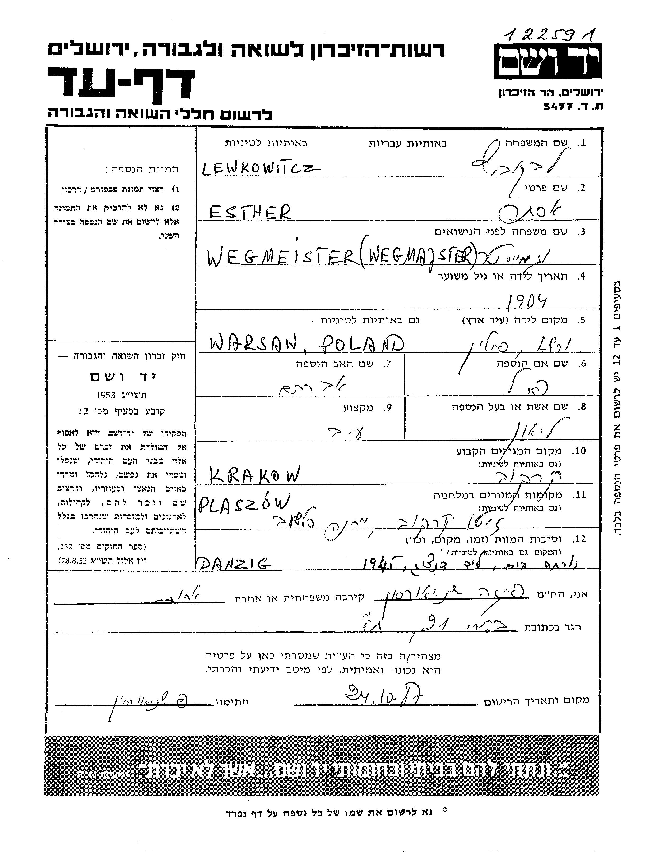 Эстер Левкович, девичья фамилия Вегмайстер, место рождения: Варшава, Польша. Отец: Авраам, mать:Перл, девичья фамилия Бланк. Домохозяйка. Женат / замужем. Место жительства до войны: Краков, Польша. Место во время войны: Плашув, Польша.