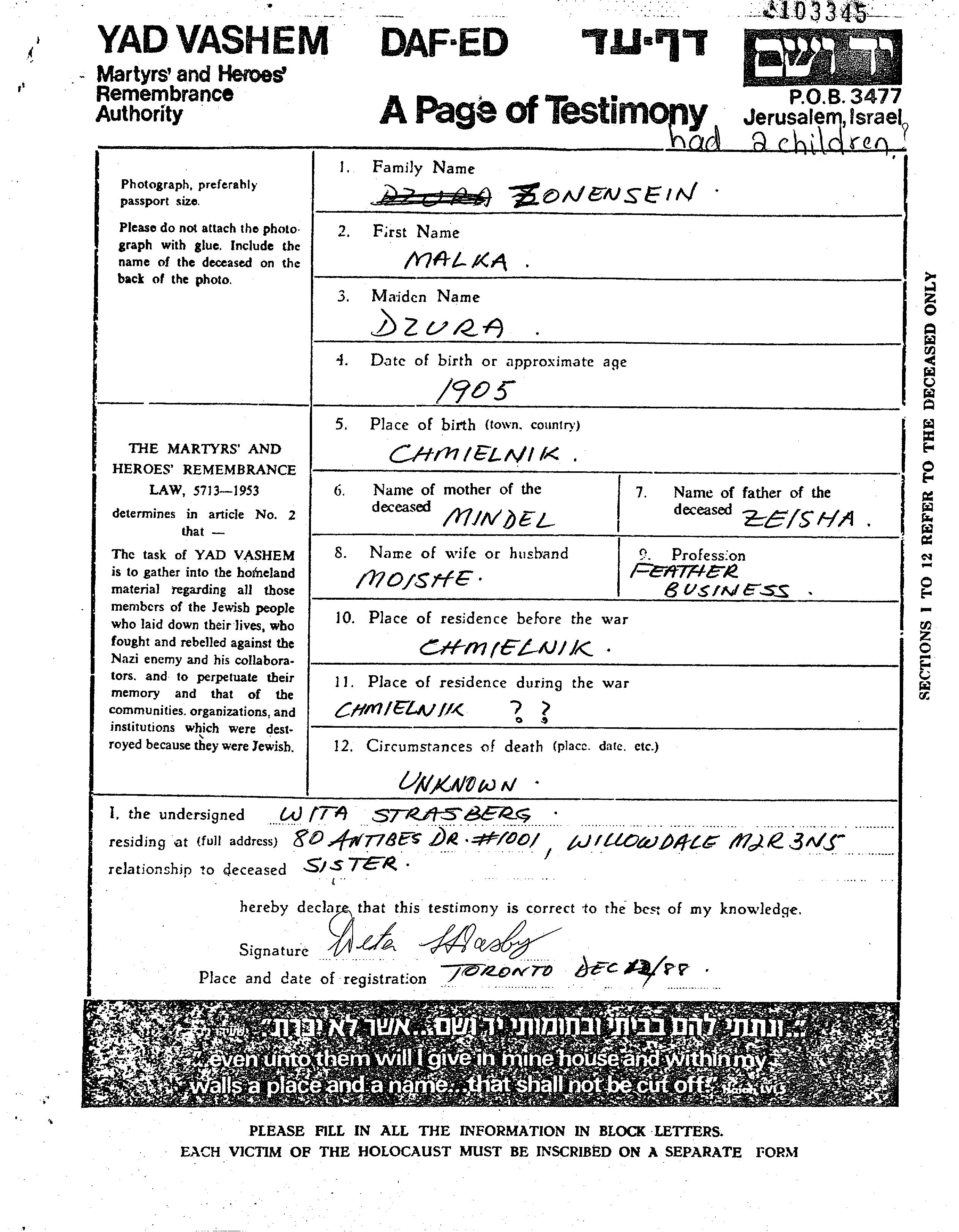 Малка Зоненшейн, девичья фамилия Дзура Дзора, место рождения: Хмельник, Польша. Отец: Зейша Зиша, mать:Миндель. Предприниматель. Женат / замужем. Место жительства до войны: Хмельник, Польша. Место во время войны: Хмельник, Польша.