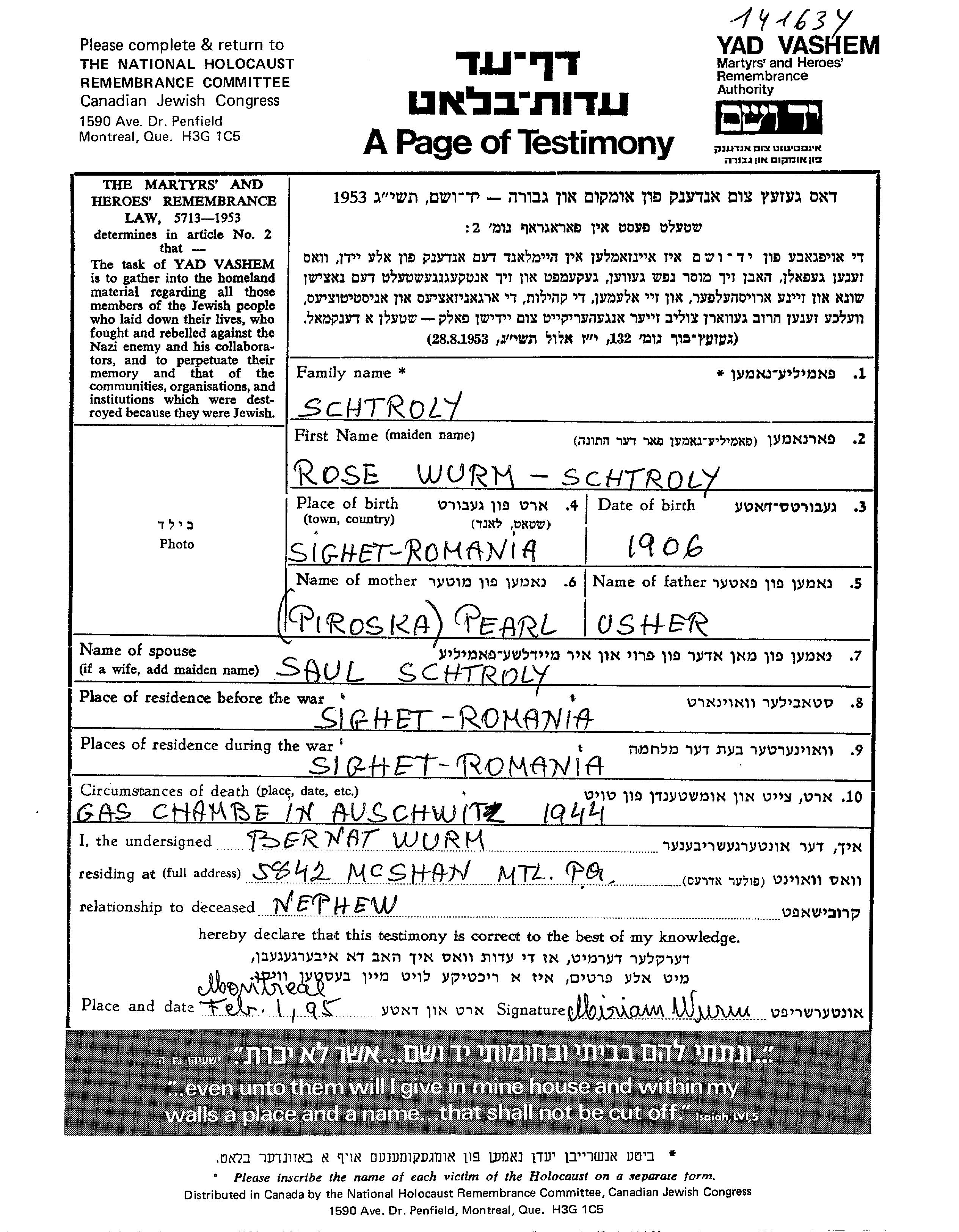Роза Штроли Штрой, девичья фамилия Вурм, место рождения: Сигет, Румыния. Отец: Ушер, mать:Перл Пироска. Женат / замужем. Место жительства до войны: Сигет, Румыния. Место во время войны: Сигет, Румыния.
