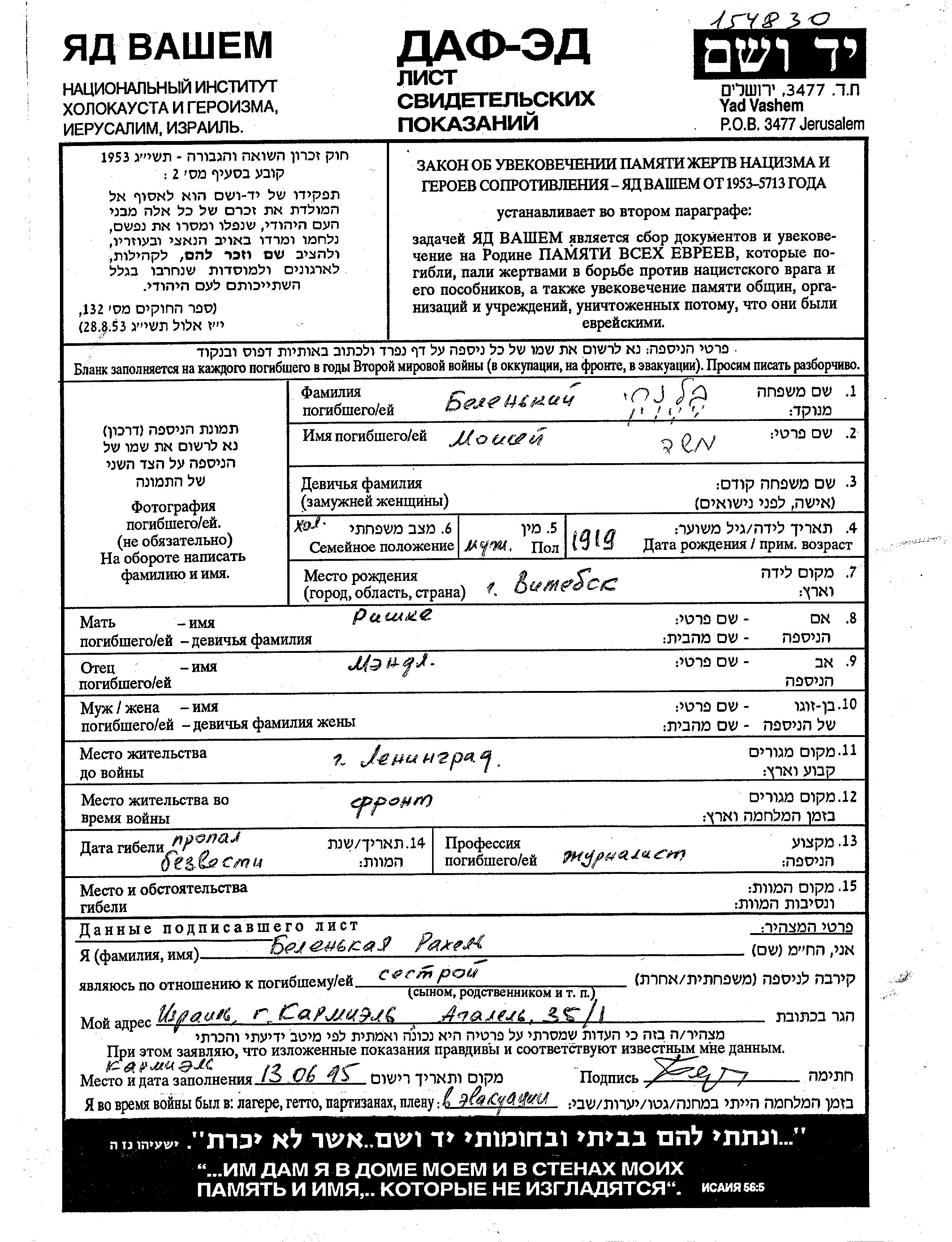 Беленький Моисей 1919 Ленинград, Россия (СССР) Лист свидетельских показаний