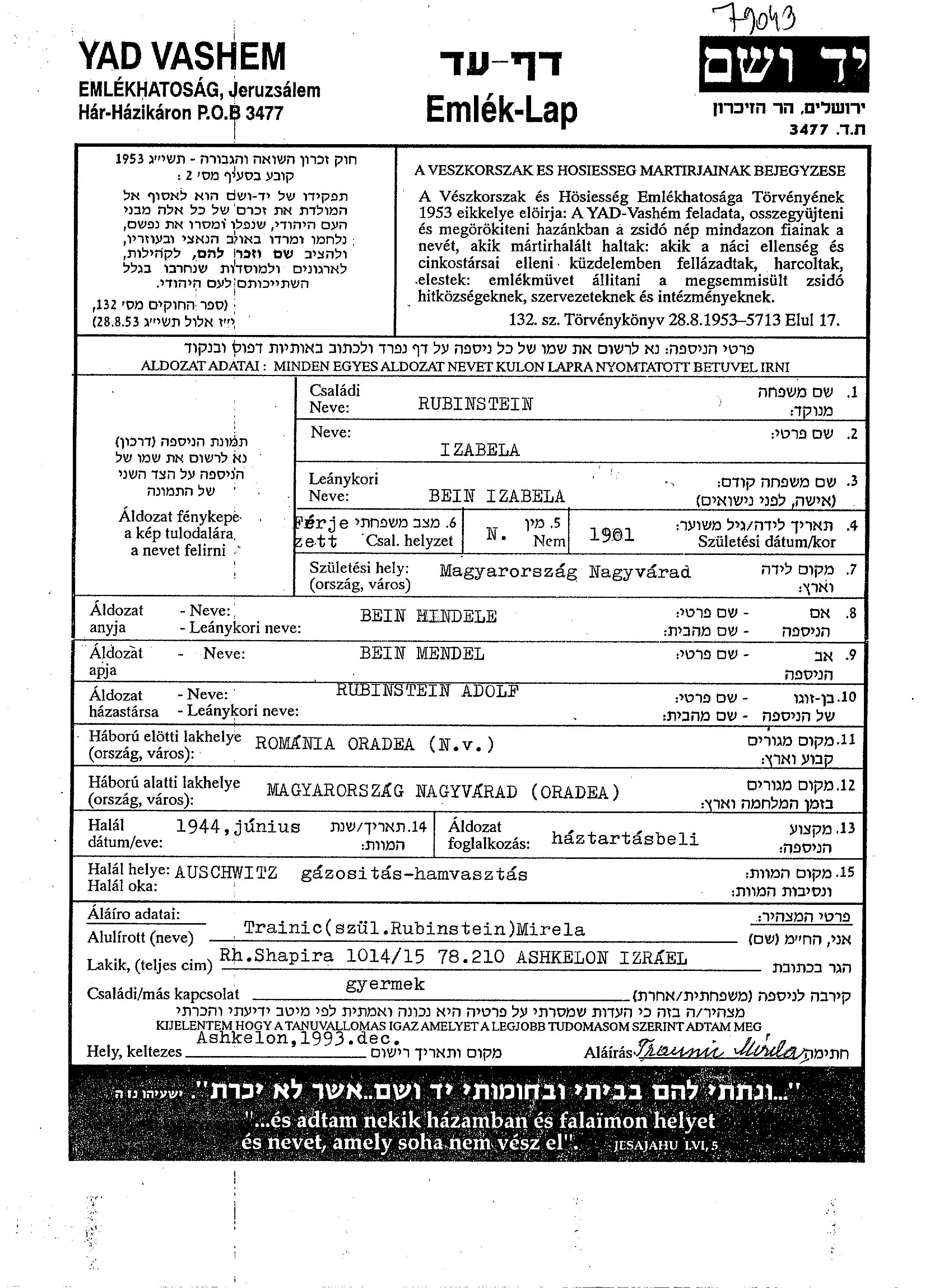 Изабелла Рубинштайн, девичья фамилия Байн, место рождения: Надьварад, Румыния. Отец: Мендель, mать:Хинделе. Домохозяйка. Женат / замужем. Место жительства до войны: Надьварад, Румыния. Место во время войны: Надьварад, Румыния.