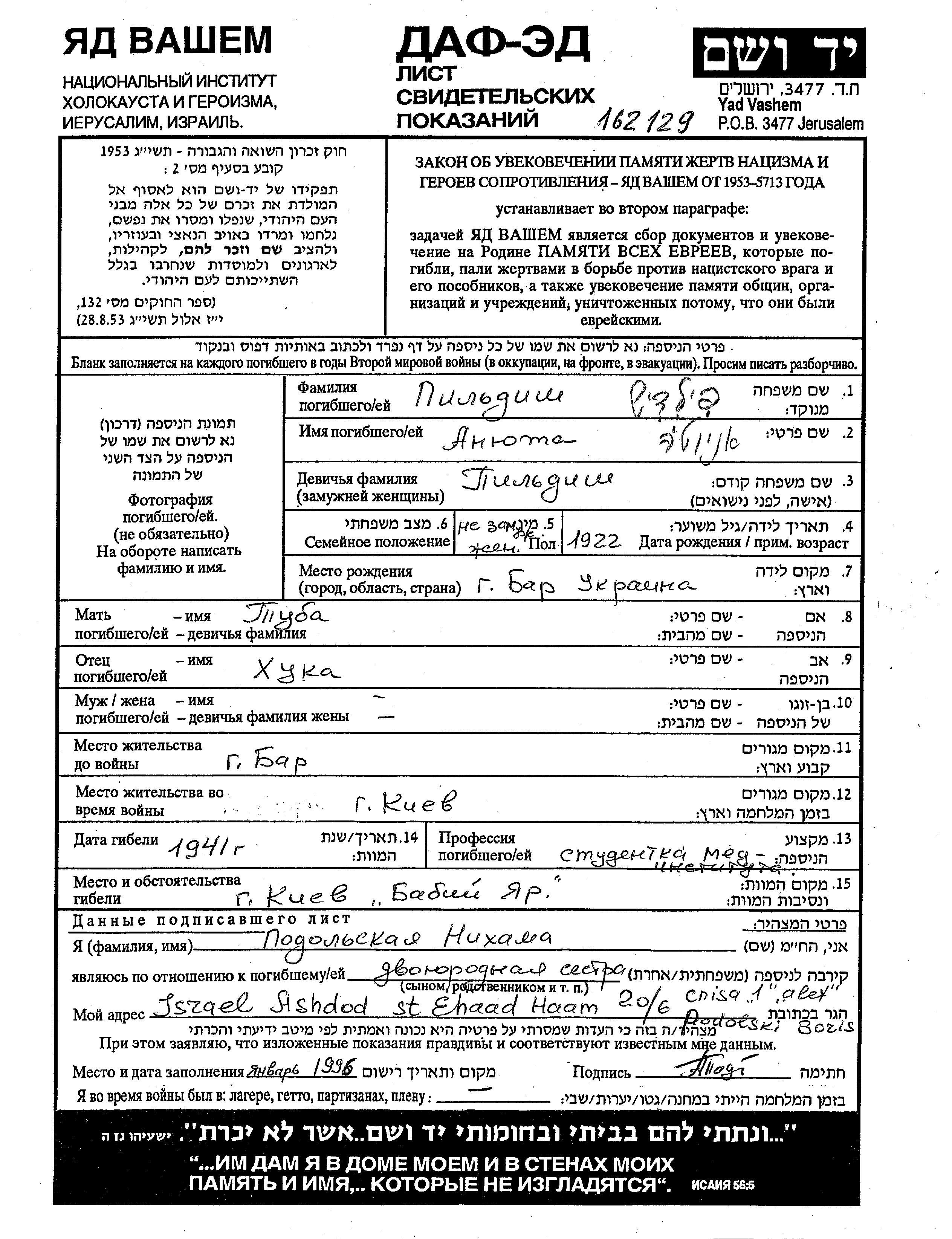Анюта Пильдиш, место рождения: Бар, Украина (СССР). Отец: Хука, mать:Туба Това, девичья фамилия Клигман. Студент / студентка. Женат / замужем. Место жительства до войны: Бар, Украина (СССР). Место во время войны: Киев, Украина (СССР).