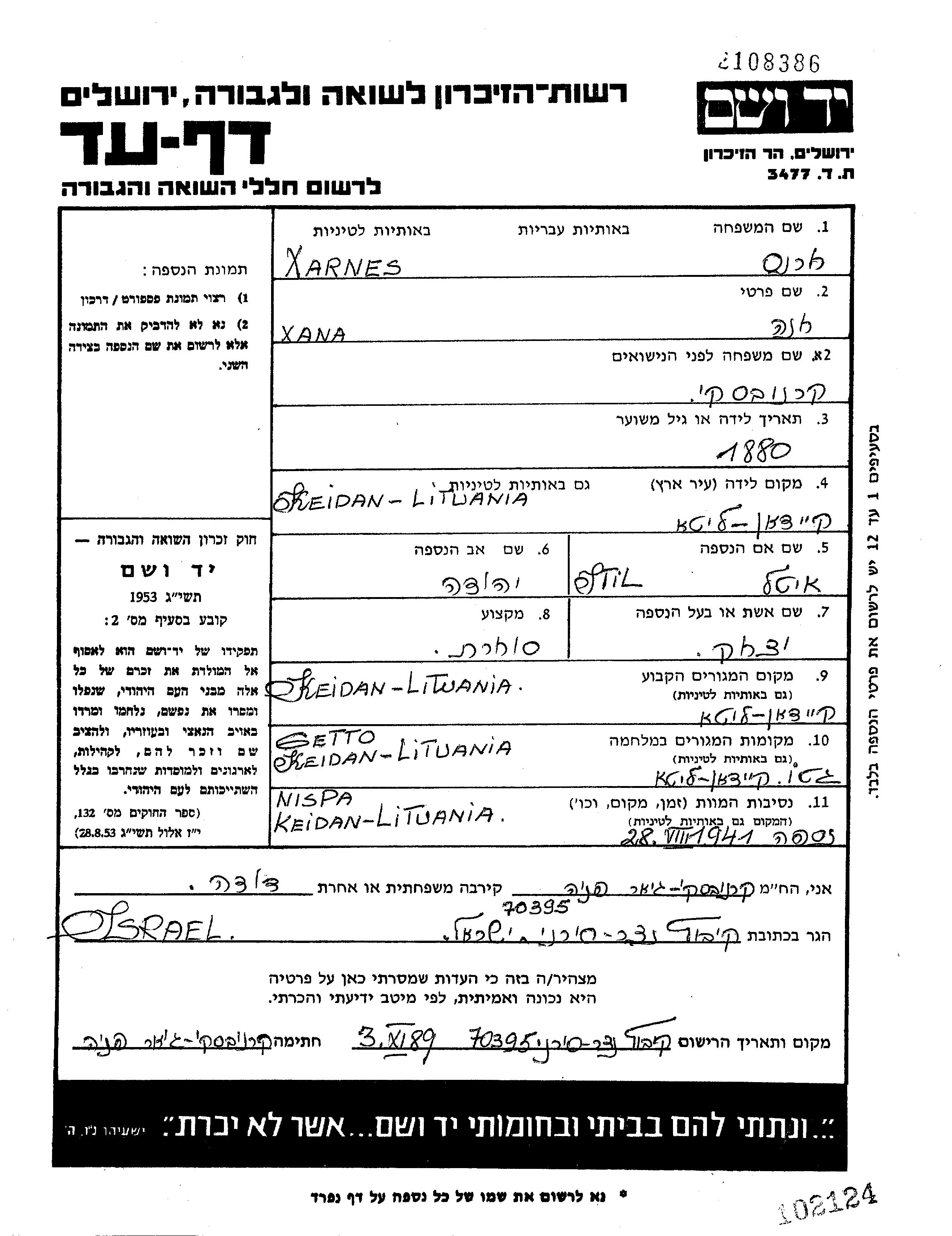 Хана Харнес, девичья фамилия Карновски, место рождения: Кейдан, Литва. Отец: Егуда, mать:Итиль. Торговец / торговка. Женат / замужем. Место жительства до войны: Кейдан, Литва. Место во время войны: Кейдан, Литва.