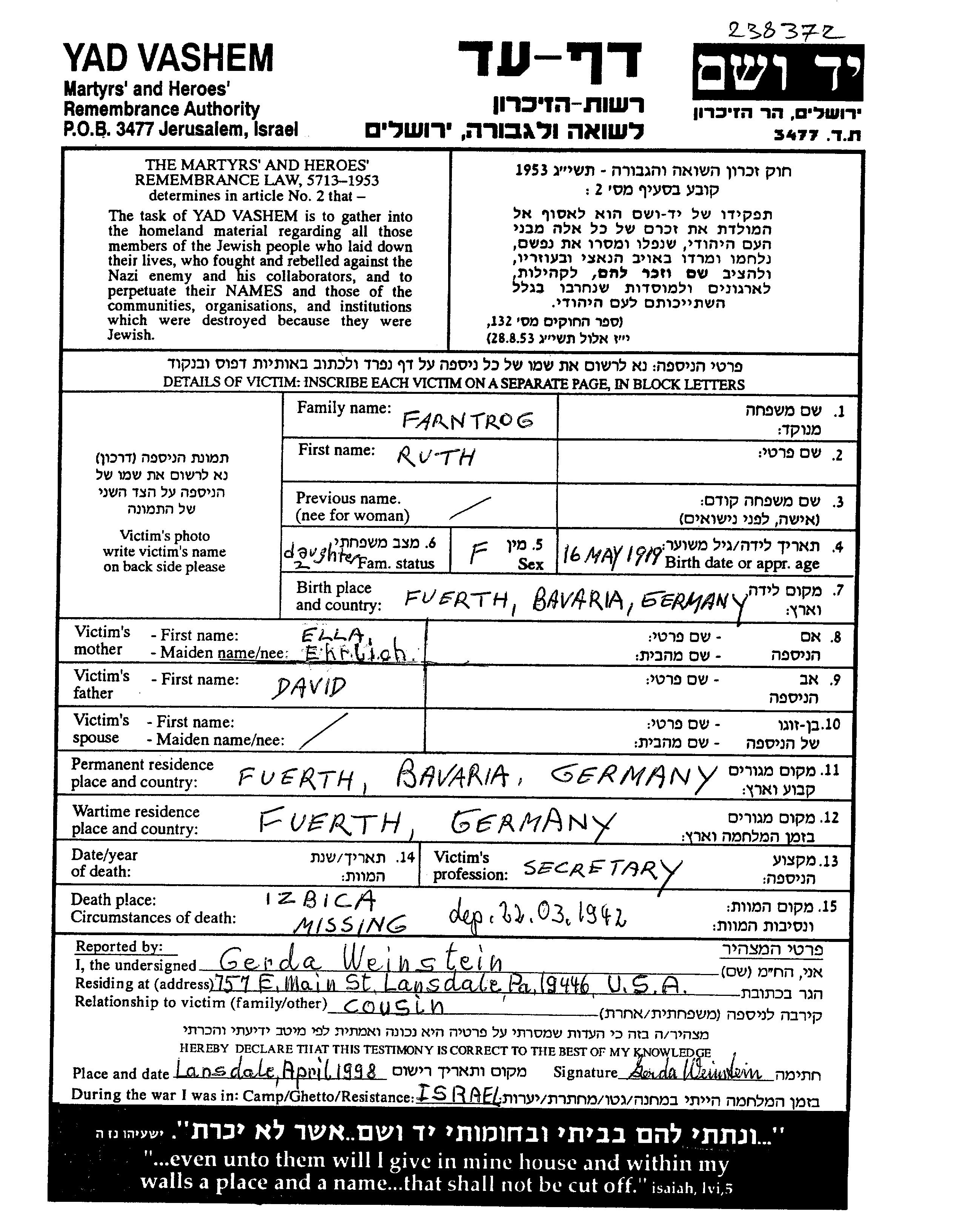 Рут Фарнтрог, место рождения: Фюрт, Германия. Отец: Давид, mать:Элла, девичья фамилия Эрлих. Секретарь. Холост / не замужем. Место жительства до войны: Фюрт, Германия. Место во время войны: Фюрт, Германия.