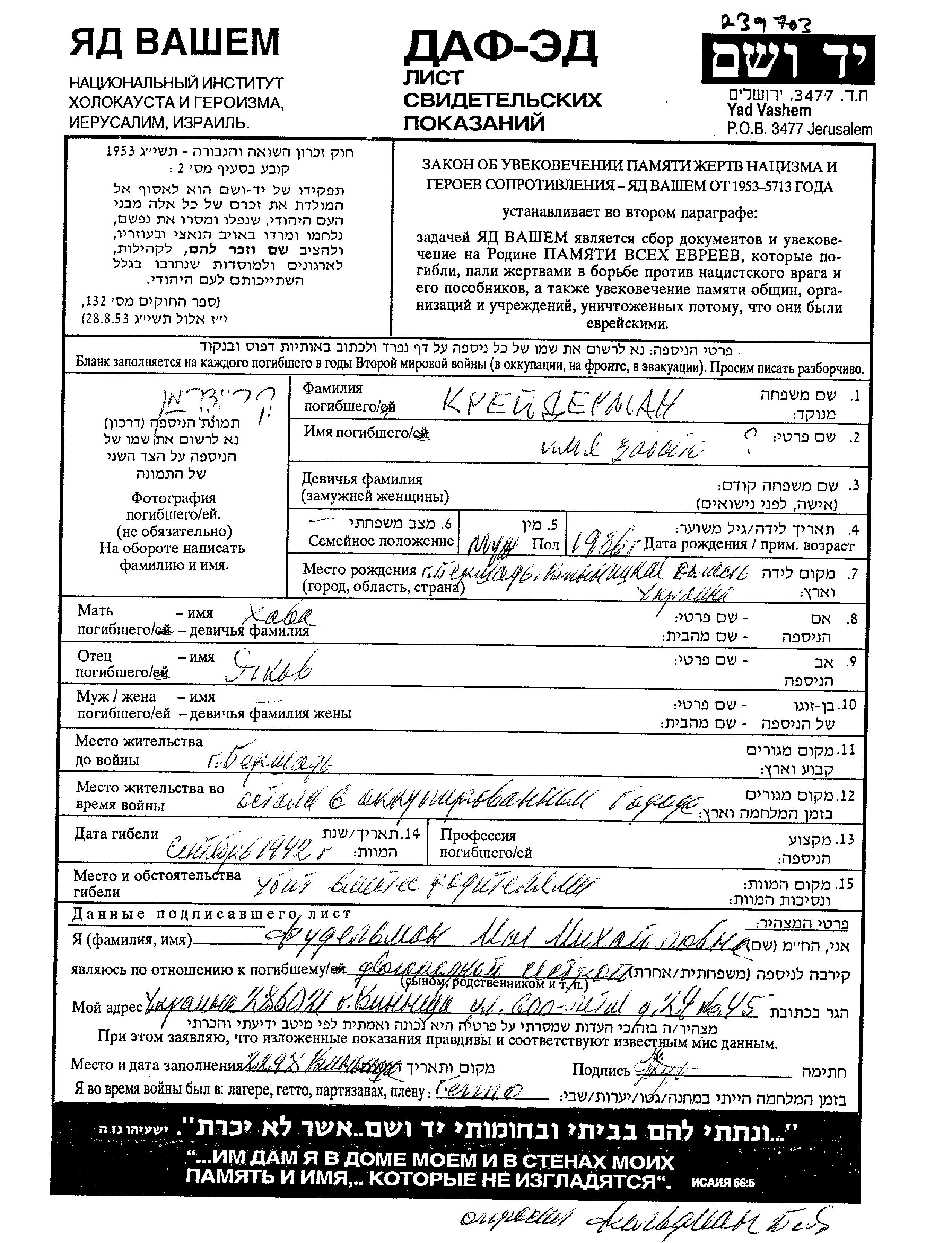 Крейдерман Имя неизвестно 1936 Бершадь, Украина (СССР) Лист свидетельских показаний