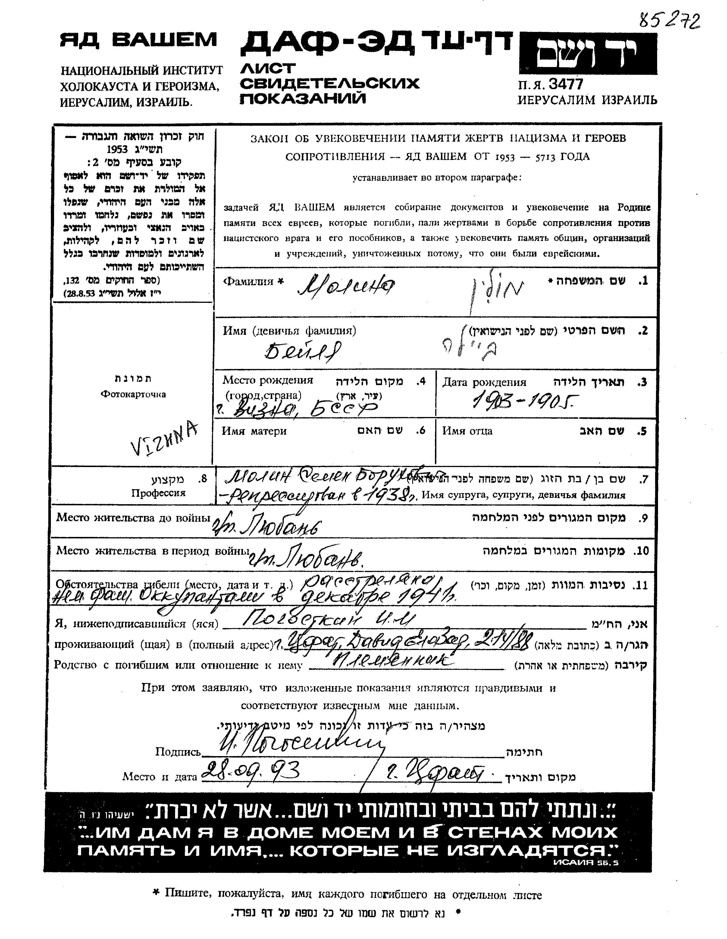 Бейля Молин, место рождения: Вызна, Белоруссия (СССР). Женат / замужем. Место жительства до войны: Любань, Белоруссия (СССР). Место во время войны: Любань, Белоруссия (СССР).