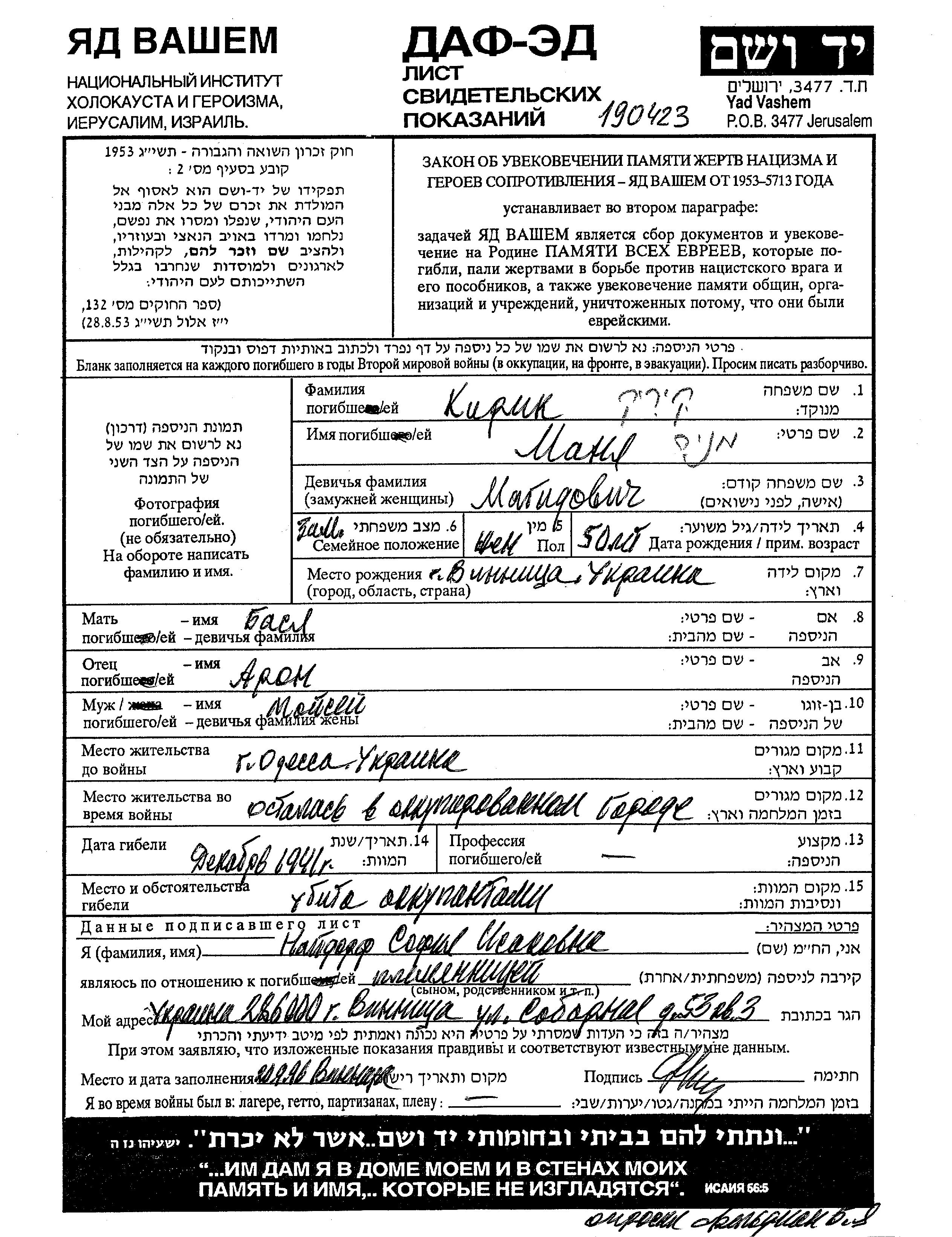 Кирик Маня 1891 Одесса, Украина (СССР) Лист свидетельских показаний