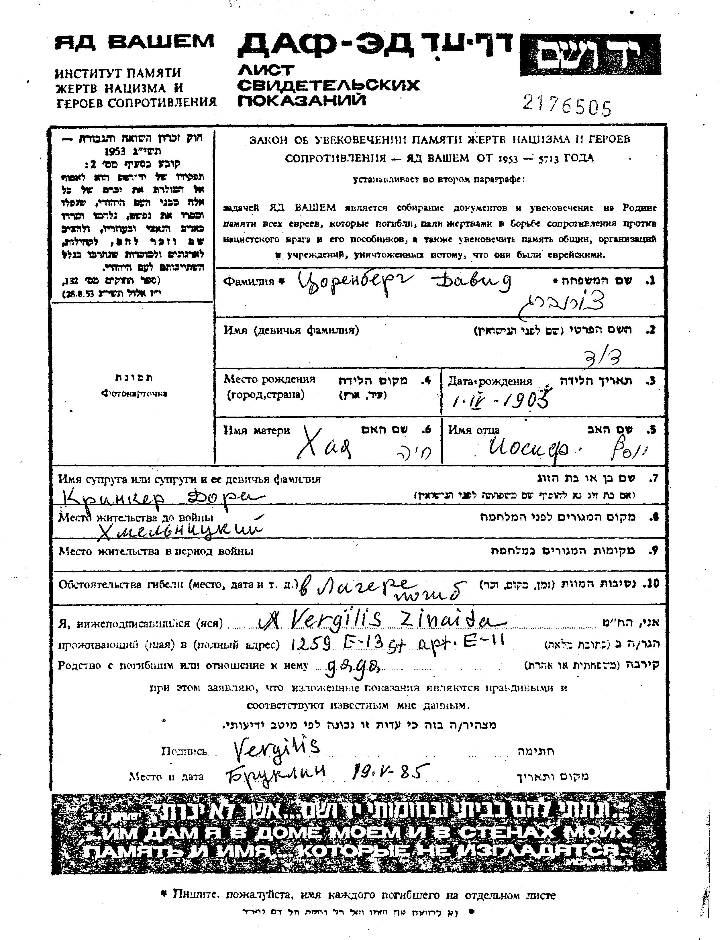 Цоренберг Давид 1905 Проскуров, Украина (СССР) Лист свидетельских показаний