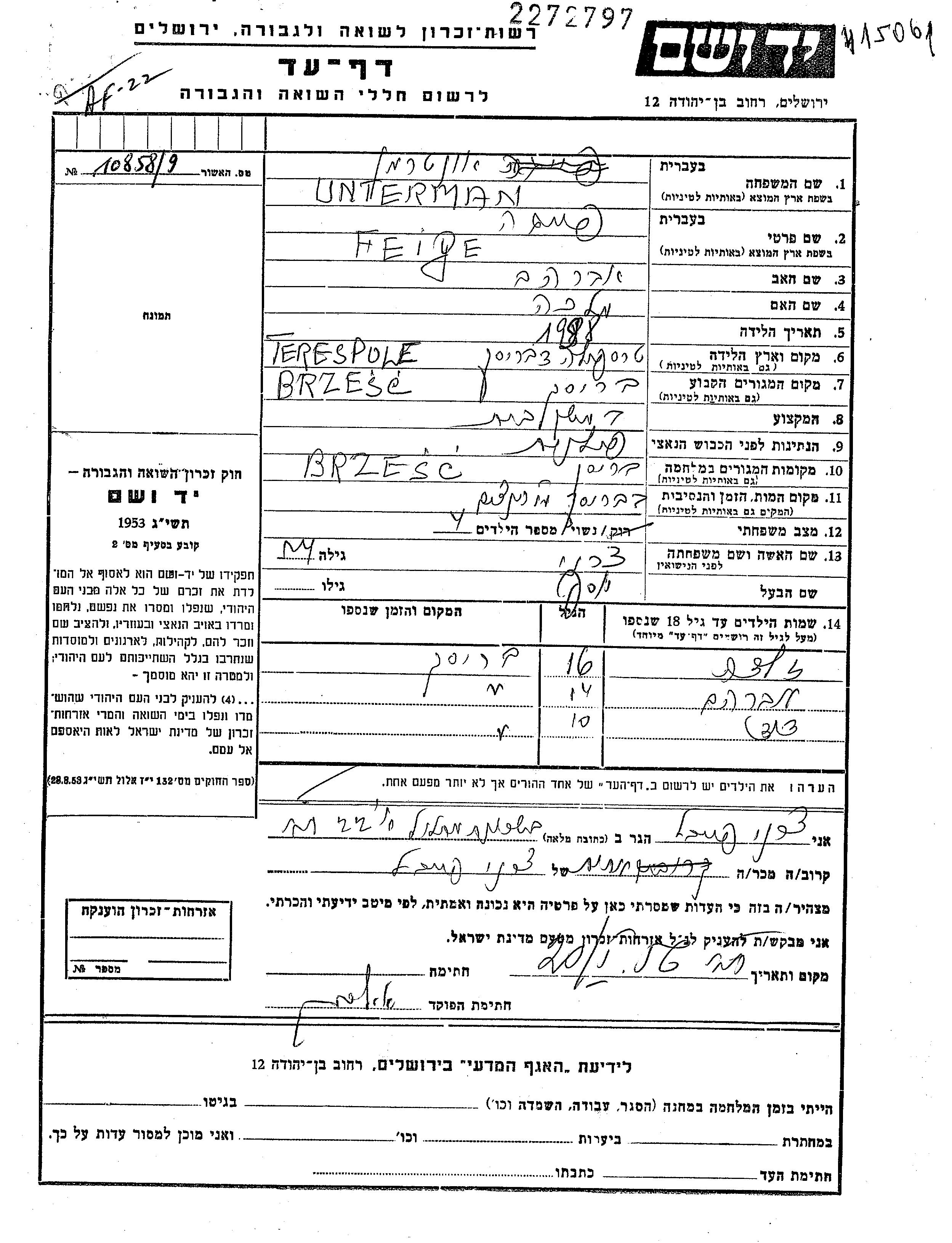 Фейга Унтерман, девичья фамилия Чарни, место рождения: Тересполь, Польша. Отец: Авраам, mать:Малка. Домохозяйка. Женат / замужем. Место жительства до войны: Брест Над Бугом, Польша. Место во время войны: Брест Над Бугом, Польша.