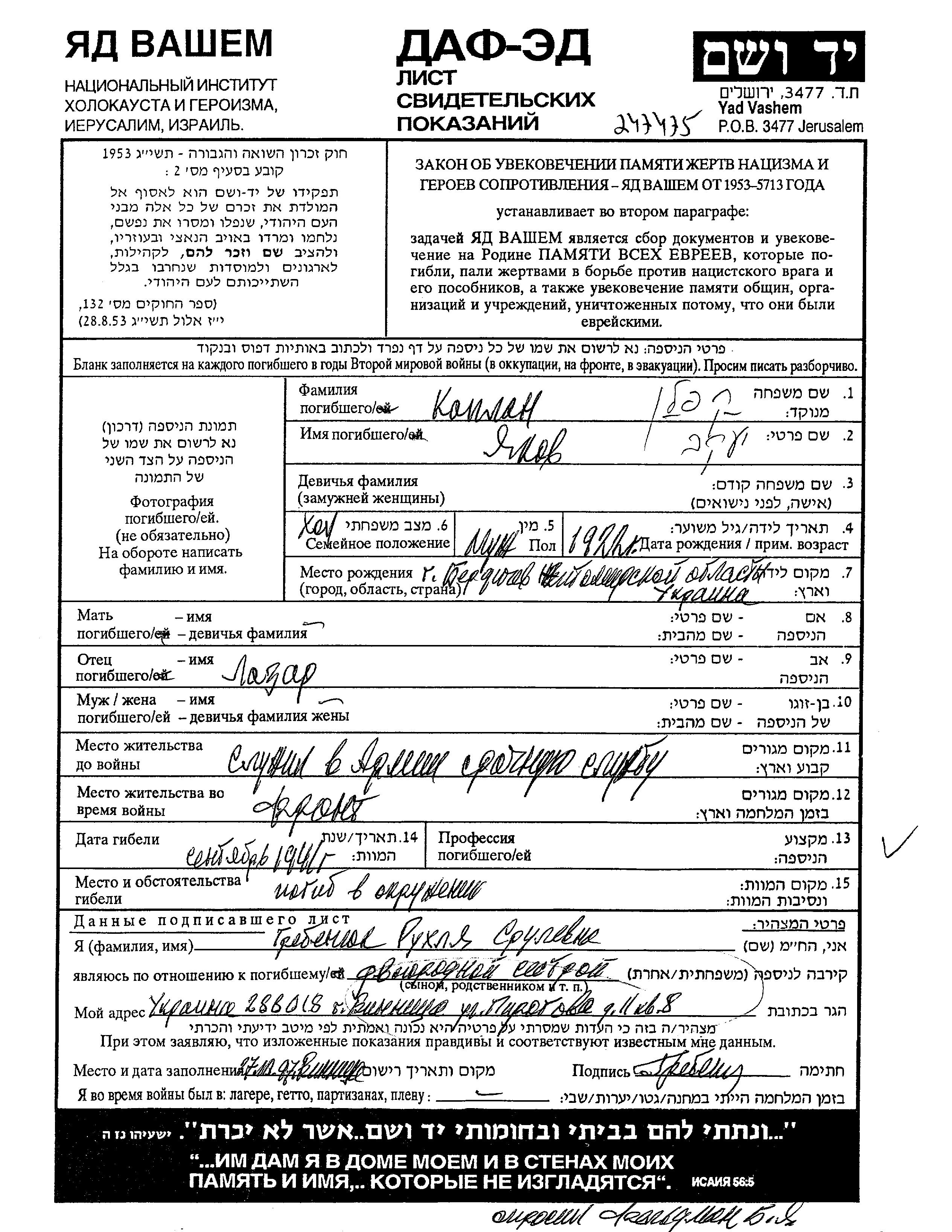 Яков Каплан, место рождения: Бердичев, Украина (СССР). Отец: Лазарь. Холост / не замужем. Место жительства до войны: Вооруженные силы Советского Союза. Место во время войны: Вооруженные силы Советского Союза. Яков погиб на военной службе. место смерти: неизвестно в 1941.