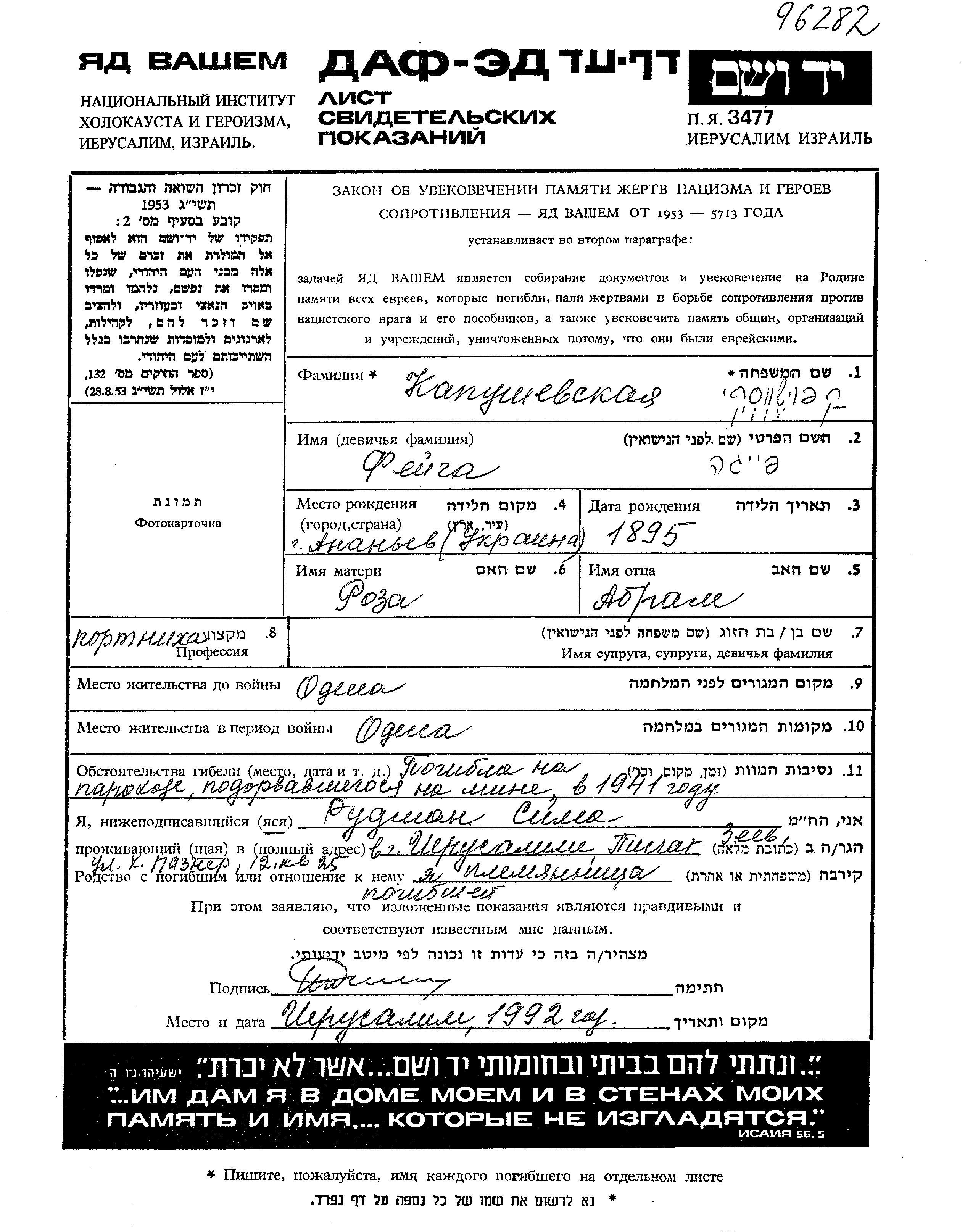 Капушевский Фейга 1895 Одесса, Украина (СССР) Лист свидетельских показаний