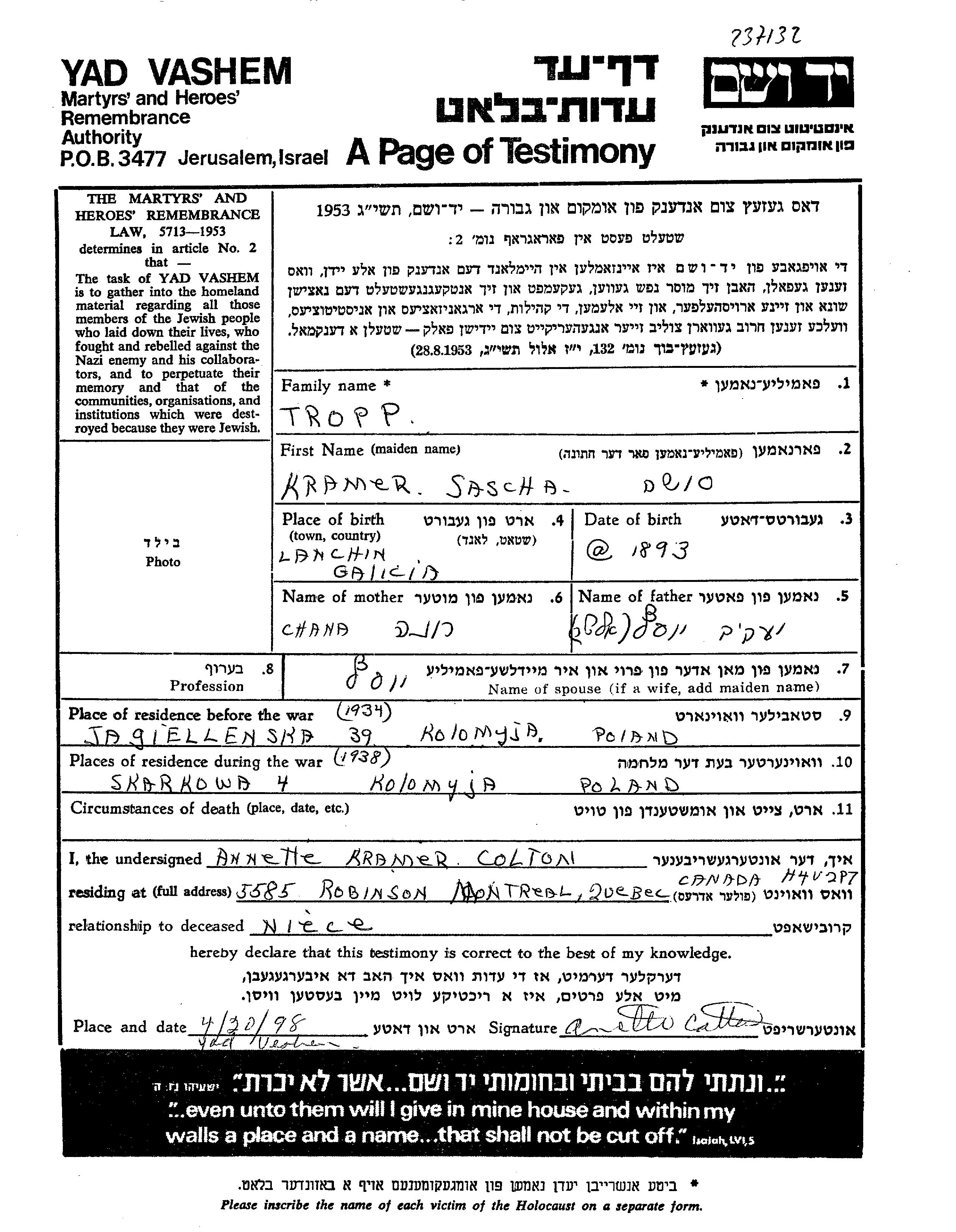 Саша Тропп, девичья фамилия Крамер, место рождения: Ланчин, Польша. Отец: Яков Иосеф Алтер, mать:Хана, девичья фамилия Шпербер. Женат / замужем. Место жительства до войны: Коломыя, Польша. Место во время войны: Коломыя, Польша.