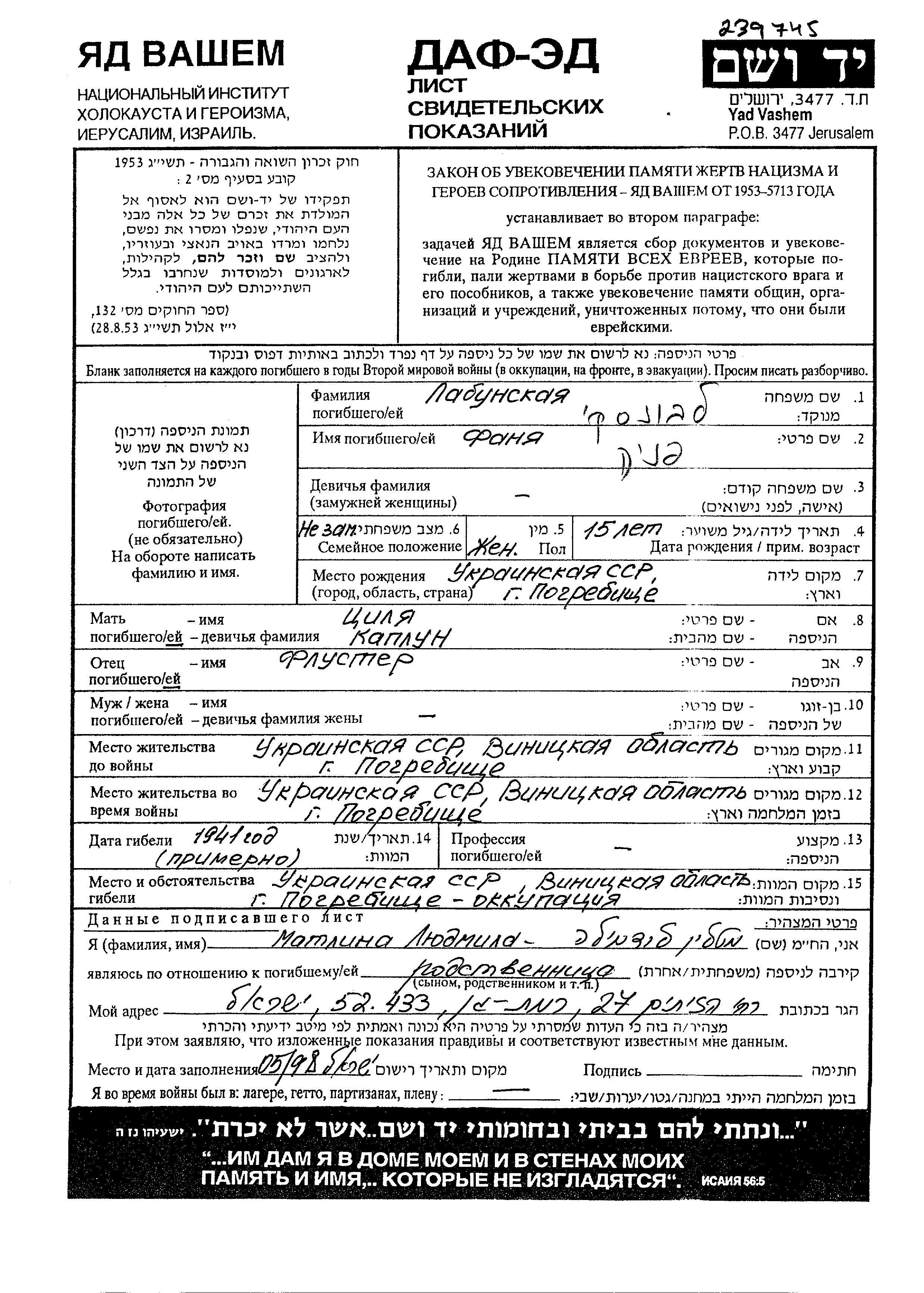 Лабунски Фаня 1926 Погребище, Украина (СССР) Лист свидетельских показаний
